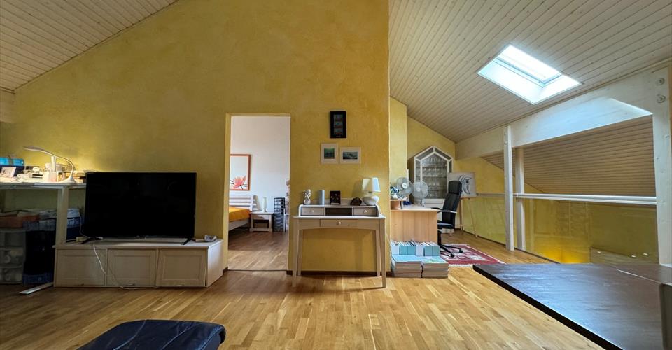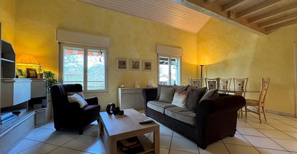 Environnement Il s’agit d’un magnifique appartement attique duplex de 6 pièces au 1er étage. L’appartement est très bien aménagé avec une belle pièce à vivre donnant sur le balcon. Il comprend trois chambres à coucher. L’immeuble a été construit en 1991 et se situe au calme au centre du village de Cartigny. La copropriété est très bien entretenue et bénéficie du charme de la campagne. Intérieur Rez inférieur 1 hall d’entrée avec armoires encastrées 1 grand séjour/salle à manger avec cheminée donnant sur le balcon 1 cuisine donnant sur le balcon 2 chambres à coucher chacune avec sa salle d’eau 1 WC visiteur Rez supérieur 1 chambre à coucher avec salle d’eau 1 grande pièce à vivre 1 grenier Extérieur 2 places de parking extérieures 1 jardin en copropriété 1 cave de 22m2