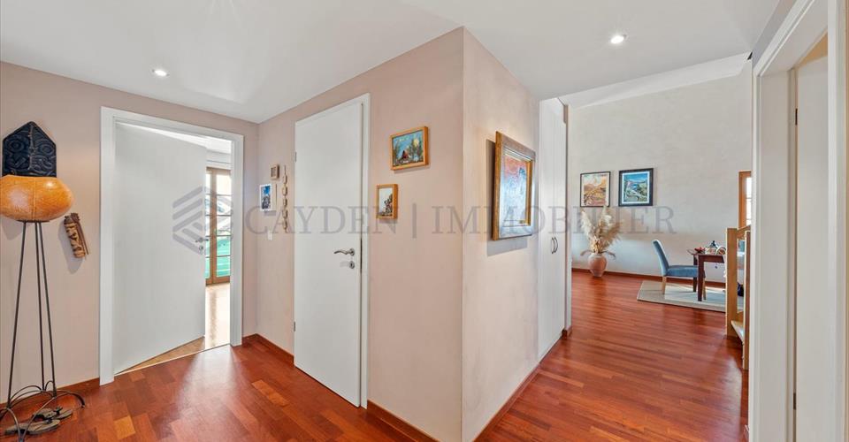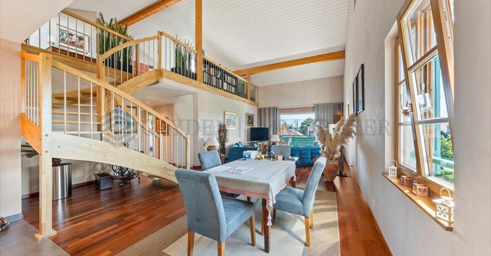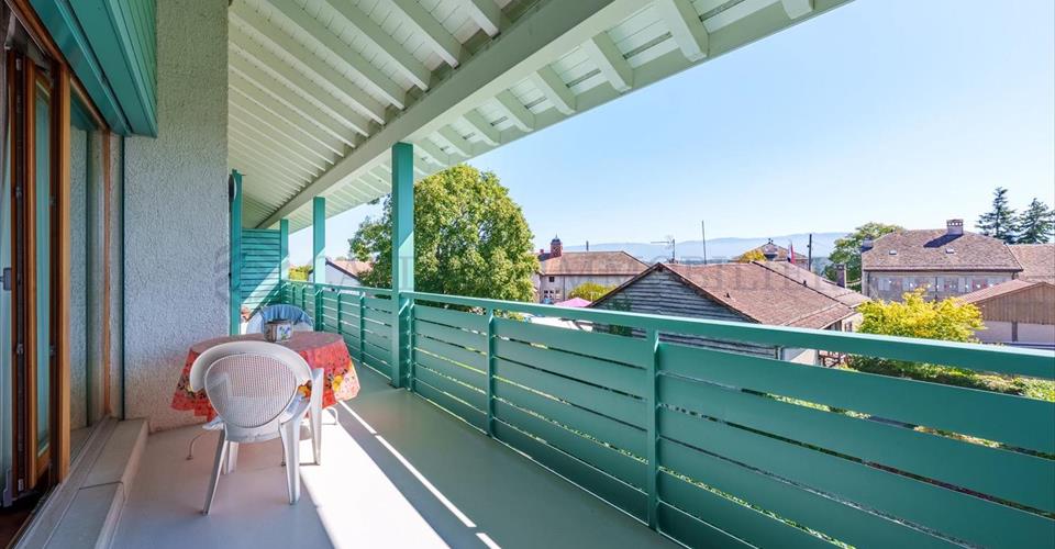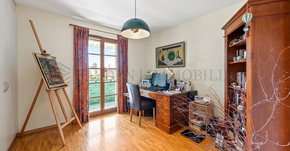 Cet attique exceptionnel qui se trouve au 2ème étage d’un immeuble très bien entretenu est au coeur de la commune de Russin, tout proche de Satigny, dans un environnement calme et privilégié. Avec ses vues dégagées et son agréable extérieur ainsi que son exposition optimale, ce bel appartement traversant offre un cadre de vie paisible et une tranquillité idéale. Moderne, il fut livré en 2008 avec des matériaux de goût et de qualité, et est en très bon état d’entretien. Ses peintures, ses sols, sa cuisine et ses salles de bains ne nécessitent aucune rénovation particulière. En véritable atout, sa mezzanine et ses incroyables hauteurs sous plafond dans le séjour qui font de lui un bien lumineux et accueillant. Le bien possède également de nombreux placards encastrés faits sur mesure. Le choix des parquets et des revêtements pose une ambiance particulièrement chaleureuse et conviviale, faisant de ce bien un objet unique. L’appartement fut régulièrement repeint et il est en très bon état d’entretien. Le bien se distribue comme suit : – Un hall d’entrée – Une salle de douche avec WC et espace buanderie – Une première chambre à coucher avec placards encastrés donnant accès à la terrasse – Une deuxième chambre avec placards encastrés donnant accès à la terrasse – Une chambre master avec ses nombreux rangements encastrés et sa salle de bains adjacente avec WC – Un spacieux séjour ouvert sur la salle à manger avec accès à la terrasse – Une cuisine ouverte totalement équipée – Une grande mezzanine pouvant faire office de bureau/ chambre d’amis avec rangements sous toiture – Deux places de parking en sous-sol – Une grande cave privative Caractéristiques : – Splendide terrasse privative avec vue dégagée – Un local à vélo – Chauffage au sol au gaz – Nombreuses places visiteurs devant la résidence