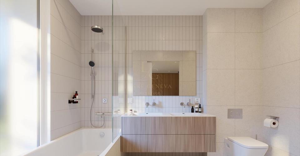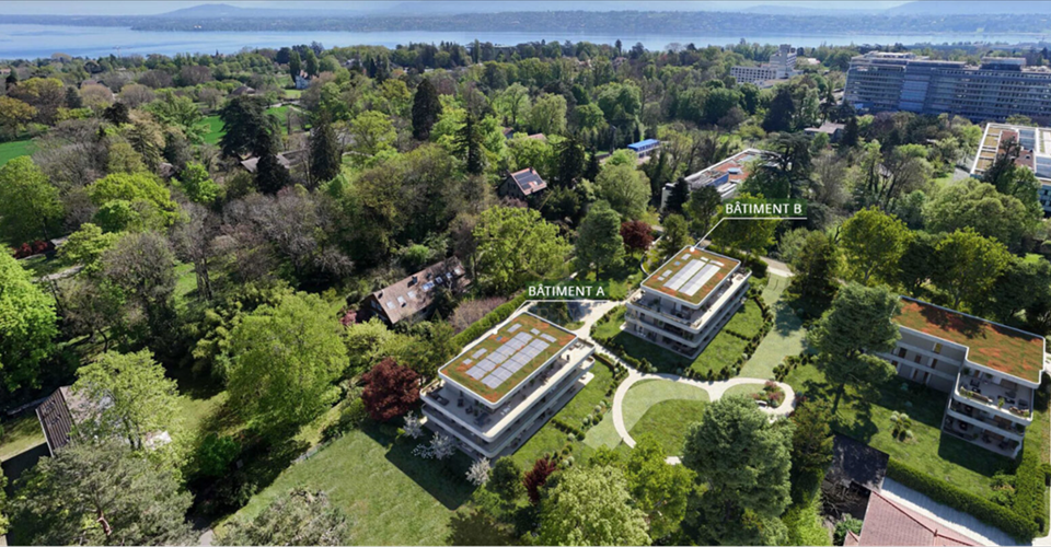 SITE INTERNET – https://jardindescrets.ch/ PRESENTATION ET SITUATION La Résidence “Jardin des Crêts” se situe dans le quartier résidentiel du Grand-Saconnex. Située sur la rive droite de Genève, en plein coeur de la Genève Internationale, proche des missions et ambassades, découvrez cette nouvelle résidence de standing vous invitant à une reconnexion avec la nature, dans un environnement exceptionnel avec un parc de plus de 5’000 m2, faiblement densifié (coefficient 0.3). Avec sa position au sommet d’une crête et au milieu des arbres centenaires, vous pourrez profiter du calme tout en étant à proximité immédiate des commodités telles que écoles, commerces et transports publics (à une minute à pied de l’arrêt de bus Grand-Saconnex John Knox). L’Aéroport International de Genève, le lac et le centre-ville se trouvent à quelques minutes seulement en voiture. ARCHITECTURE & APPARTEMENTS ENTRE 146.5 M2 ET 227 M2 PONDERES L’expression architecturale, en cohésion avec la nature, se distingue par des façades habillées en pierre naturelle et minérale ainsi que par des gardes corps en verre surplombant ainsi la verdure. Les matériaux ont été minutieusement choisis et chaque bâtiment répond à un standard de très haute performance énergétique (Minergie THPE), avec une production de chaleur assurée par des pompes à chaleur air-eau et une toiture totalement équipée de panneaux photovoltaïques. Le projet comporte 2 bâtiments de 5 appartements chacun (A & B) ainsi qu’un parking souterrain commun. Chacun des appartements jouit d’une très belle luminosité et d’une splendide et vaste terrasse couverte invitant les résidents à profiter au maximum de la vie en plein air, tout en étant à l’abri des regards des logements voisins. Les bâtiments A & B sont répartis de la façon suivante: Rez-de-chaussée: 2 x 5 pièces Premier étage: 2 x 5 pièces Attique: 1 x 6 pièces Les appartements du rez-de-chaussée profitent d’un magnifique jardin de 100 m2 orienté S/O, en plus d’une terrasse couverte. Chaque appartement bénéficie, en annexe, d’une grande cave (20 m2) ainsi que de deux places de parking intérieures (comprises dans le prix de vente). Permis de construction en force – Livraison courant septembre 2026