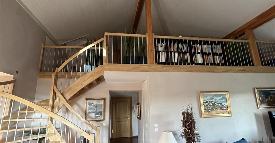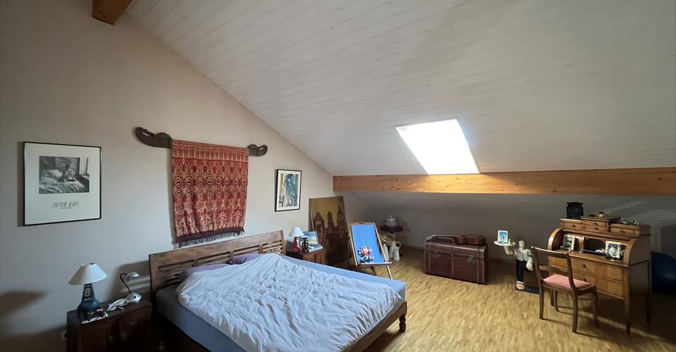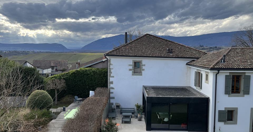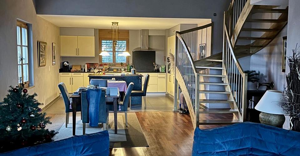 Environnement Il s’agit d’un magnifique appartement duplex de 6 pièces. L’appartement est très bien aménagé avec une magnifique et spacieuse pièce à vivre donnant sur le balcon. Cette pièce à vivre bénéficie d’une spectaculaire hauteur sous plafond. L’appartement comporte trois chambres à coucher et une grande mezzanine. Il dispose de deux places de parking en sous-sol et une grande cave. La copropriété est très bien entretenue. L’immeuble a été construit en 2007 et se situe au calme au cœur du village de Russin. Intérieur 1 hall d’entrée 1 SdB/WC 1 cuisine ouverte 1 séjour/salle à manger avec très grande hauteur sous plafond donnant sur le balcon 1 chambre parentale avec SdB/WC 2 chambres 1 grande mezzanine 1 grenier Extérieur 1 balcon 2 places de parking dans le garage 1 grande cave