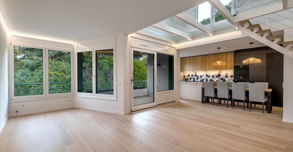 Découvrez ce bien en vidéo: https://youtube.com/shorts/SyurIV4BoS4?si=uyTlhYLYuDLB-dXd Niché au coeur d’un vaste parc privatif de 10’000m2, dans une petite résidence de standing à quelques pas du lac, ce magnifique duplex en attique offre un cadre de vie d’exception. Situé à seulement 250 mètres de Port-Choiseul et de la plage de Versoix, il bénéfice d’un emplacement idéal pour une famille. Entièrement rénové avec soin en 2024, cet appartement traversant de 6 pièces, d’une surface PPE d’environ 213 m2, bénéficie de prestations haut de gamme et de finitions luxueuses. Au 1er étage, vous découvrirez un spacieux hall d’entrée, des toilettes visiteurs avec dressing ainsi qu’une magnifique cuisine avec îlot central entièrement équipée. Le vaste séjour/salle à manger s’ouvre sur une loggia avec vue sur le parc et constitue un espace de vie lumineux et convivial. Deux grandes chambres avec leur salle de bains et douche attenante complètent ce niveau. Au deuxième étage se trouve une grande pièce pouvant faire office de salon de télévision ou de bureau ainsi qu’une magnifique suite parentale avec dressing et grande salle de bains attenante. Ce niveau donne accès à une rare terrasse de près de 100 m² avec vue imprenable sur la parc et la nature environnante, un véritable havre de paix profitant du soleil toute la journée. Un box dans le parking souterrain, une cave à vin climatisée et une cave complètent cet ensemble d’exception. L’immeuble est équipé d’un ascenseur et la résidence profite d’un accès sécurisé ainsi que de places visiteurs. Venez découvrir ce lieu où luxe et nature se rencontrent, à quelques pas du lac !