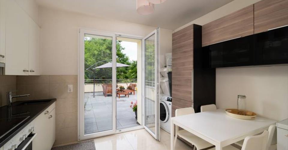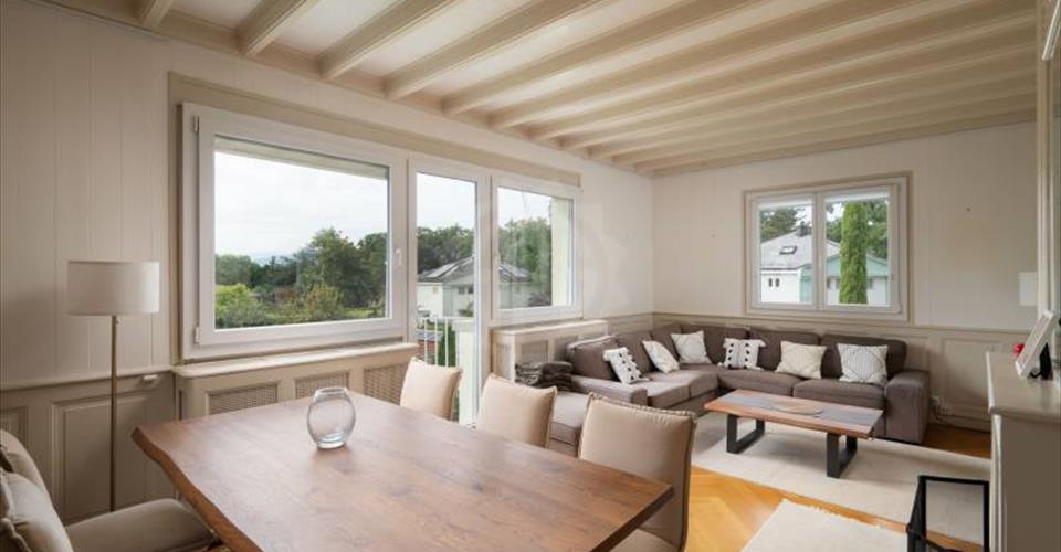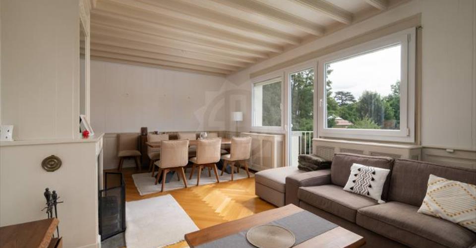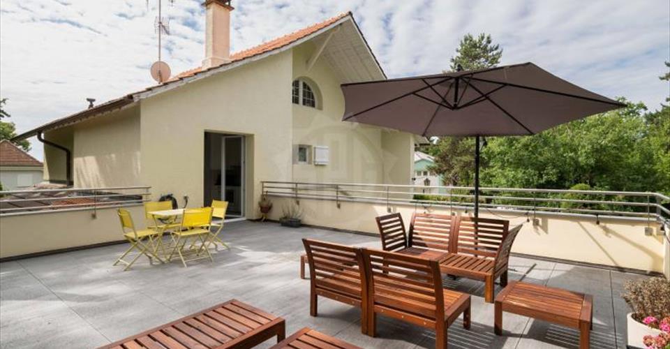 – Quartier de Bellevue – Vue sur le lac – Vue sur les Alpes – Duplex – Au 1er étage – Disponible rapidement Cet appartement en duplex, situé à 5 minutes des Organisations Internationales, se situe dans une maison individuelle située au calme et dans un cadre verdoyant. Au 1er étage : Halle d’entrée WC visiteurs Cuisine fermée, entièrement agencée et équipée, accès belle et spacieuse terrasse de 50m2 Séjour avec cheminée fonctionnelle, accès petit balcon Chambre à coucher avec salle de bains / WC attenante Chambre à coucher Au 2ème étage : Chambre à coucher avec vue lac Salle de douche / WC attenante Nombreux rangements sous les toits À l’extérieur, 2 places de parking sont à disposition à bien plaire. Une belle terrasse de 50m² avec vue sur le lac et les alpes vient compléter le tout. LOYER : CHF 4’500.00 CHARGES (FORFAIT) : CHF 350.00 DISPONIBILITE : 01.09.2025