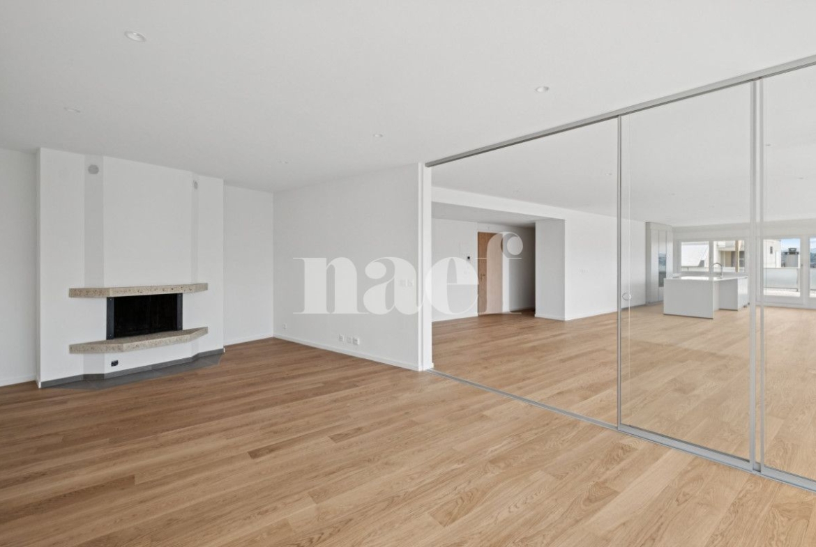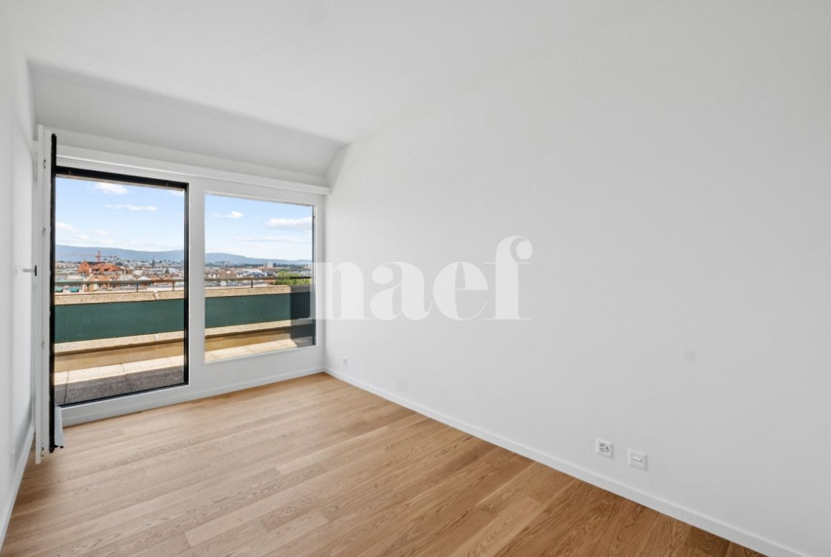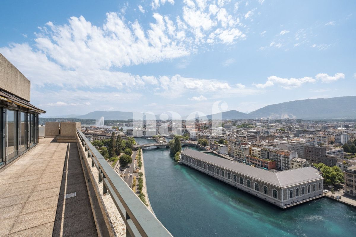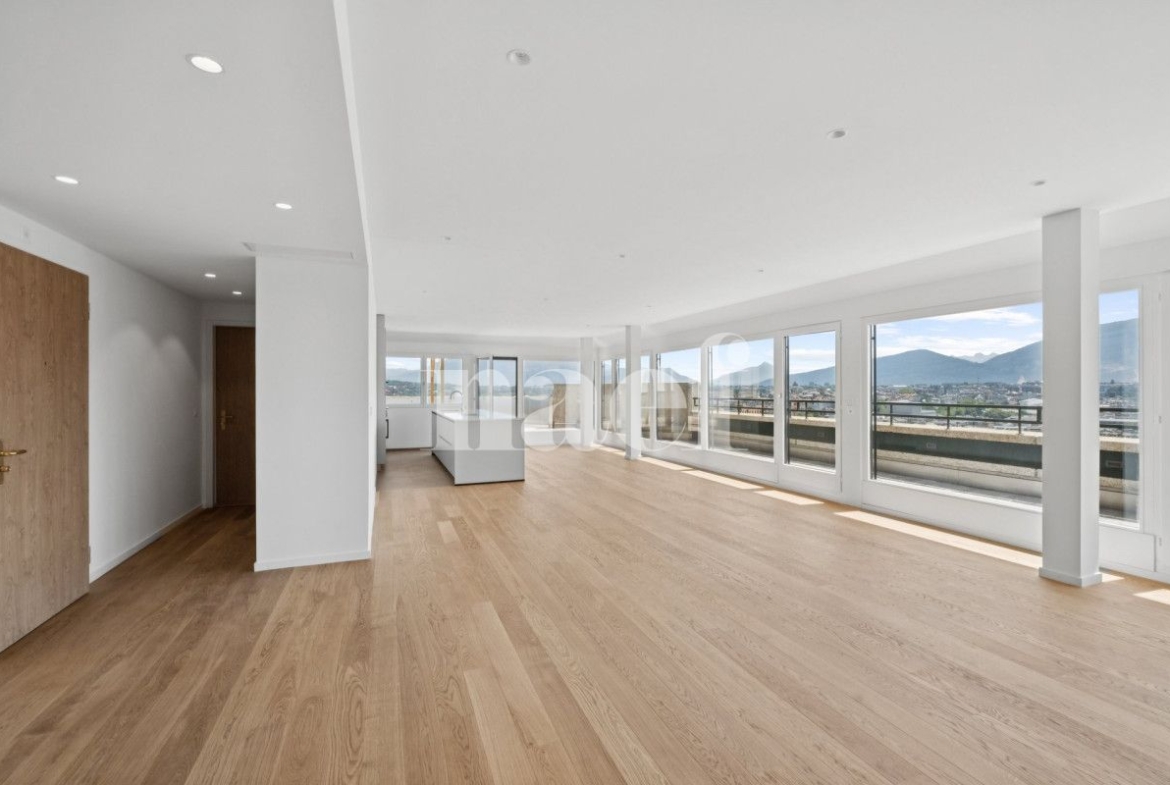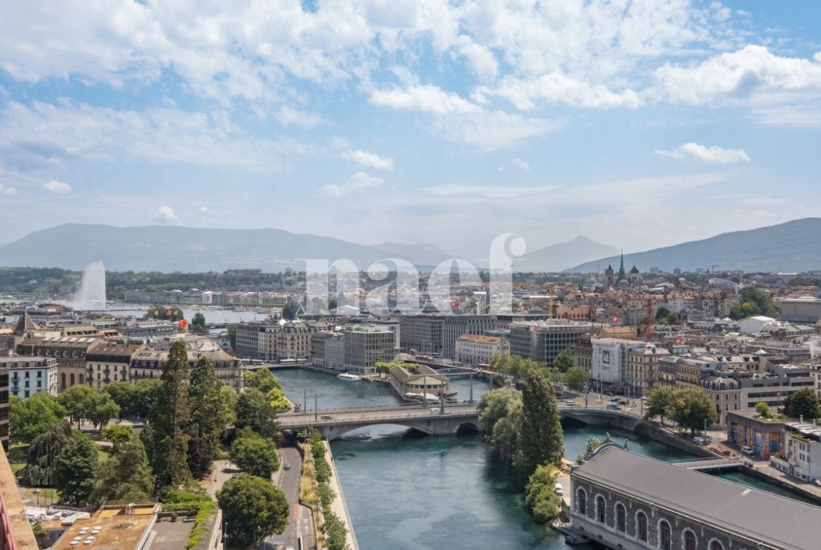 Cet appartement de 7 pièces entièrement rénové avec des matériaux de haut standing se situe au 16ème étage d’un immeuble résidentiel, sur le quai du Seujet au bord du Rhône.