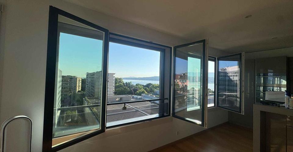 Magnifique appartement traversant de 6 pièces d’une surface d’environ 130 m2 au 8ème. Situé entre le lac et les Nations Unies, la rue Butini se trouve à proximité des transports publics genevois (TPG – Gare Cornavin) et des grands axes routiers (autoroute Lausanne). Cet appartement a été créé en 2012 lors de la surélévation de l’immeuble et aménagé dans un esprit contemporain. De plus, il offre une vue imprenable depuis le séjour et la cuisine. Il se compose comme suit : Hall d’entrée avec placards, spacieuse pièce de vie de 52 m2 avec vue sur le lac comprenant séjour, salle à manger et cuisine contemporaine équipée. Coin nuit : dégagement, 2 chambres à coucher dont la suite parentale avec son dressing, une salle de douche/wc attenante à la chambre parentale, une salle de bains/wc, buanderie / réduit, toilettes visiteurs. Stores électriques, chauffage au sol, une cave, immeuble sécurisé (code d’entrée), avec ascenseur. En option parking intérieur CHF. 300.– et/ou parking extérieur CHF. 200.– par mois.