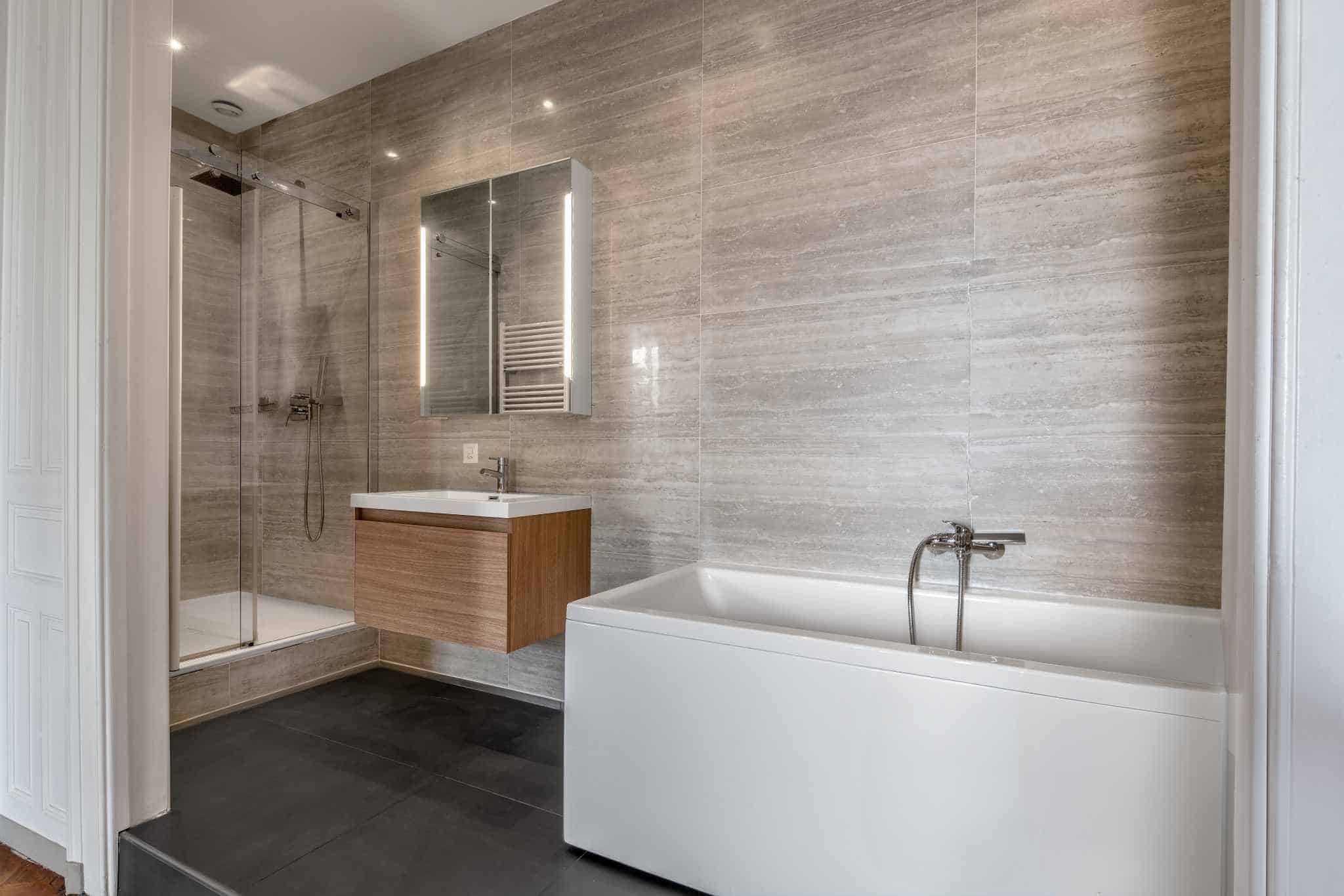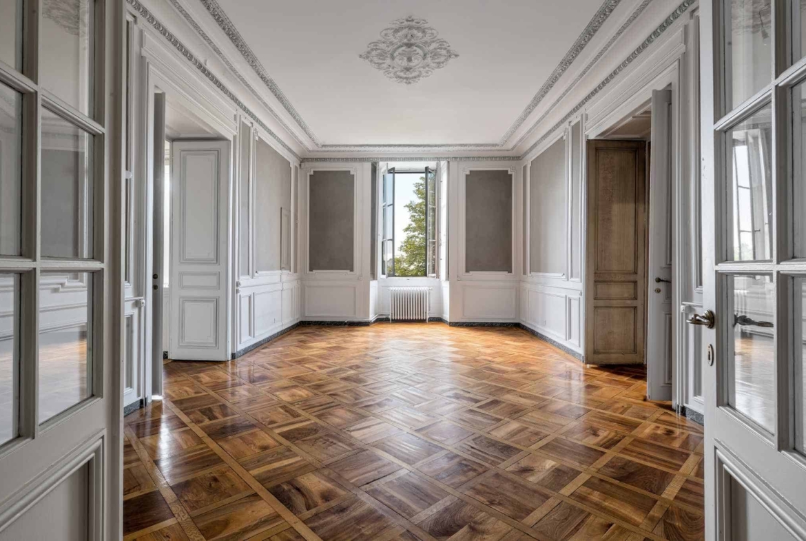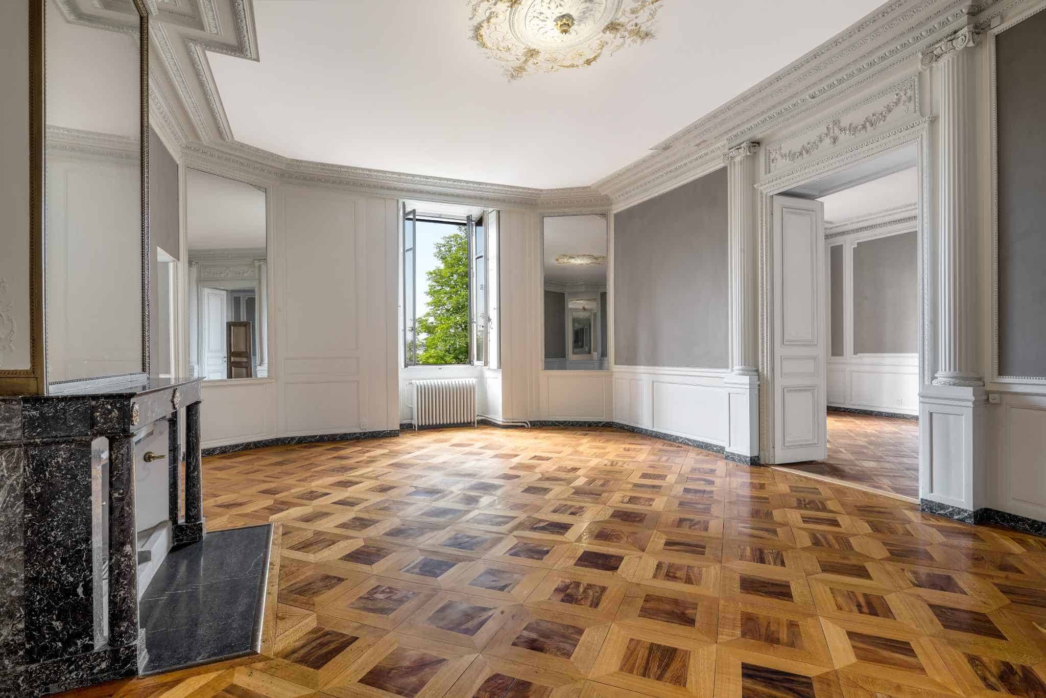 À l’origine, un seul appartement occupait tout le 1er étage, l’étage noble, pour une surface totale de 490 m2. Aujourd’hui, cet appartement pourrait être réuni aux deux autres lots également en vente, actuellement reliés par un couloir privé donnant accès à un ascenseur.