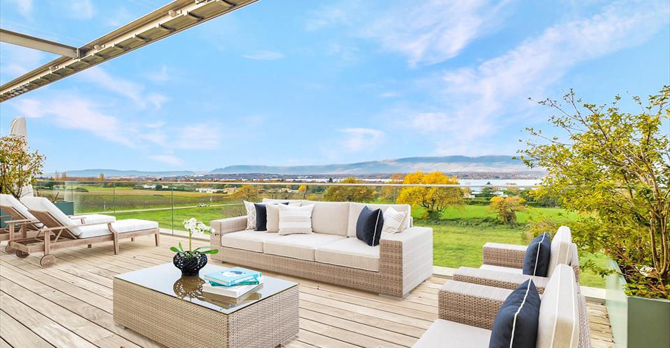 Somptueux attique en duplex aux volumes rares, offrant un cadre de vie d’exception. Situé à Corsier, sur la rive gauche de Genève, dans un environnement calme et verdoyant, il bénéficie d’une vue panoramique spectaculaire sur la campagne et le lac. À quelques pas du village de Corsier et de ses commodités locales, cet appartement bénéficie d’un emplacement privilégié. Construit en 2013, dans une résidence de standing respectueuse des normes écologiques et certifié Minergie, il combine une performance énergétique optimale et un confort de vie moderne. Réparti sur 320 m², l’appartement est baigné de lumière grâce à ses grandes baies vitrées et à un puits de lumière traversant du haut en bas, qui inonde l’ensemble des espaces d’une clarté naturelle et confère à l’ensemble une atmosphère lumineuse et accueillante. À l’étage supérieur, une grande cuisine ouverte avec îlot central équipée d’appareils Gaggenau ravira les amateurs de gastronomie. Cet espace s’ouvre sur une salle à manger spacieuse, idéale pour recevoir famille et amis. Deux chambres à coucher avec balcons, deux salles de bains, ainsi qu’un toilette visiteurs complètent cet étage. Une magnifique terrasse spacieuse de 47 m² offre un cadre idéal pour se détendre en plein air et profiter pleinement de la vue panoramique. Un superbe escalier mène à l’étage inférieur, où se trouve un vaste salon avec une cuisine d’appoint et balcon, baigné de lumière naturelle grâce à de généreuses baies vitrées. Ce niveau comprend également une suite parentale composée de deux chambres avec balcons, dont l’une peut être aménagée en un spacieux dressing. Une grande salle de bains, un WC séparé, une buanderie et un toilette visiteurs viennent compléter cet étage, alliant praticité et confort. Ce duplex exclusif, associe confort moderne, optimisation de la lumière et vue à couper le souffle. Il offre un cadre de vie unique, alliant modernité et raffinement au cœur d’un environnement naturel privilégié.