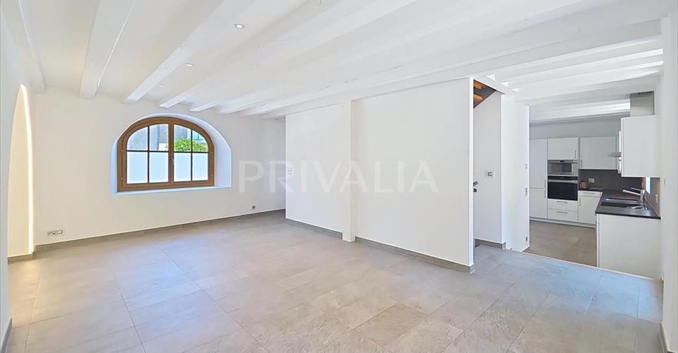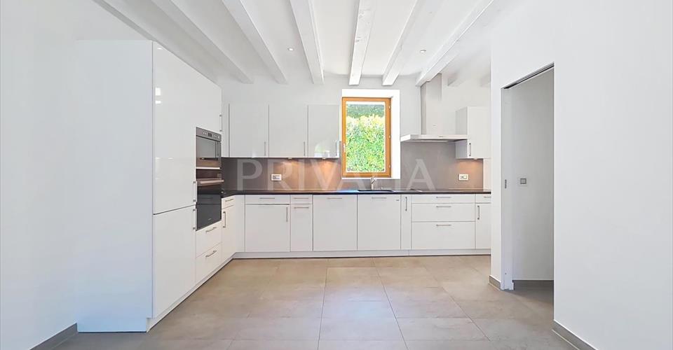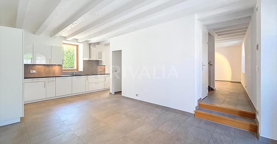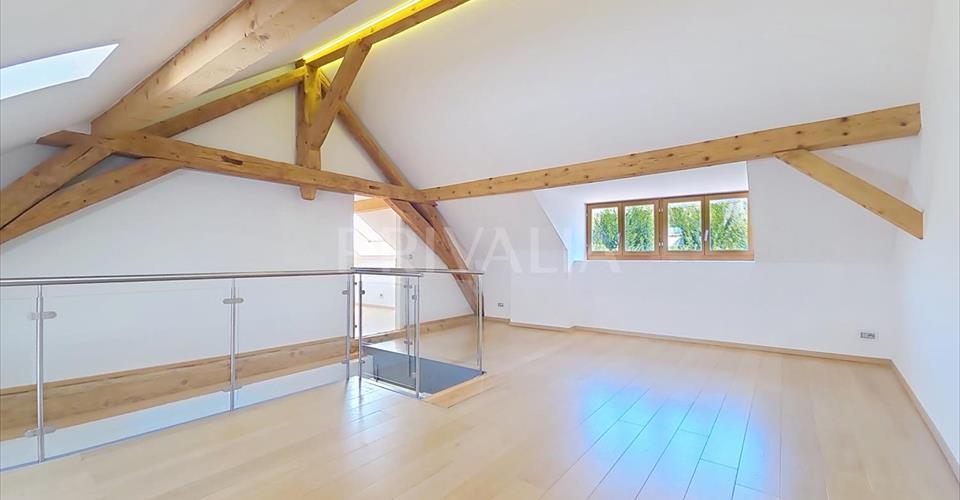 Situé sur la Capite, dans le quartier de Vésenaz, à quelques minutes du lac et des toutes les commodités, ce triplex de haut standing offre une surface de 270 m2 PPE répartis en 7 pièces avec une terrasse arborée d’environ 70 m2. Construit en 2014, il bénéficie de prestation de premier choix, tels que salles d’eau modernes, salle de douche à l’italienne, parquet ou encore hauts plafonds mansardés avec poutres apparentes qui lui confèrent tout le charme des anciennes maisons villageoises. Il offre une distribution fonctionnelle et agréable dans un style contemporain et épuré. Erigé sur trois niveaux, il se distribue comme suit : Rez-de-chaussée : – Cuisine ouverte agencée et équipée avec accès terrasse – Salle à manger – Séjour avec accès à la terrasse – WC visiteurs – Local buanderie (à équiper) Premier étage : – Vaste suite parentale avec sa salle de douche à l’italienne attenante – 2 chambres à coucher – Salle de bains avec WC Deuxième étage : – Chambre à coucher avec sa salle de bains avec WC ensuite et son dressing – Belle pièce à vivre (petit salon, pièce TV, bureau) Une cave ainsi que deux places de parking intérieures (incluses dans le loyer) situées dans un garage sécurisé complètent l’ensemble. A proximité de toutes les commodités (commerces, restaurants, centres commerciaux, écoles publiques et privées) et arrêt de bus n°A et E. L’accès au centre-ville se fait en moins de 10 minutes en voiture et 20 minutes en bus. Charges en sus à 600.- / mois.