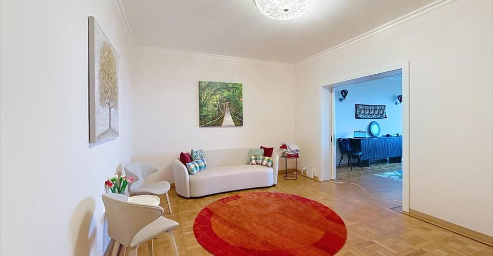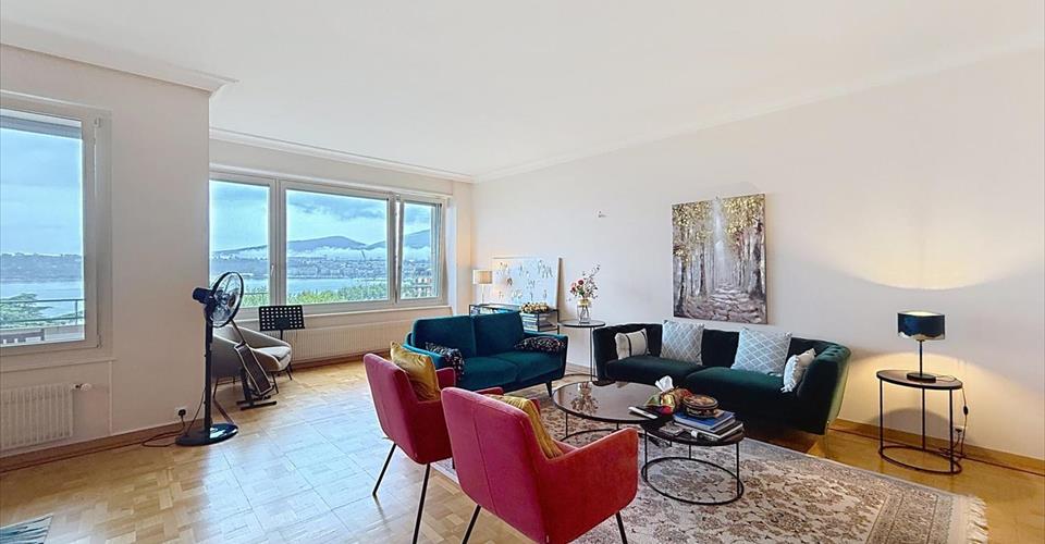 Splendide appartement de 7 pièces (157 m PPE) situé au 6ème étage d’une résidence sécurisée de haut-standing nichée dans un magnifique parc arboré privatif. Proche des Organisations Internationales et de toutes les commodités telles que les commerces et les transports publics. Le logement se distribue comme suit: Spacieux hall d’entrée avec armoires intégrées Cuisine fermée entièrement équipée où vous pourrez installer une petite table d’appoint, avec accès au balcon vue parc Vaste et agréable espace de vie (deux séjours et une salle à manger en enfilade), avec accès au balcon vue lac WC visiteurs Partie nuit: Suite parentale avec salle de bains (baignoire, double vasque et espace buanderie) et dressing attenants 2 chambres à coucher Salle de douche (douche, lavabo) Ce bien profite de beaux volumes et de nombreux espaces de rangement. Une cave et un garage complètent les prestations de ce bien. CONDITIONS LOCATIVES: Loyer: CHF 6’425.– /par mois Charges: CHF 280.–/par mois Garage interne: inclus dans le loyer Disponible: 15.12.2025