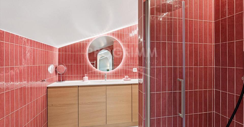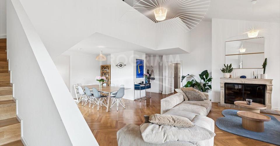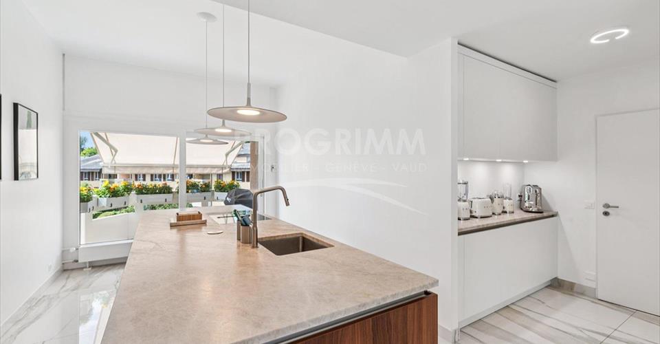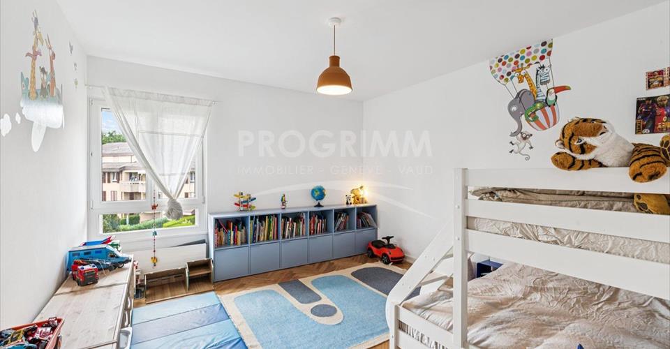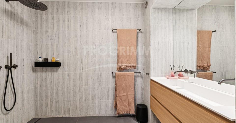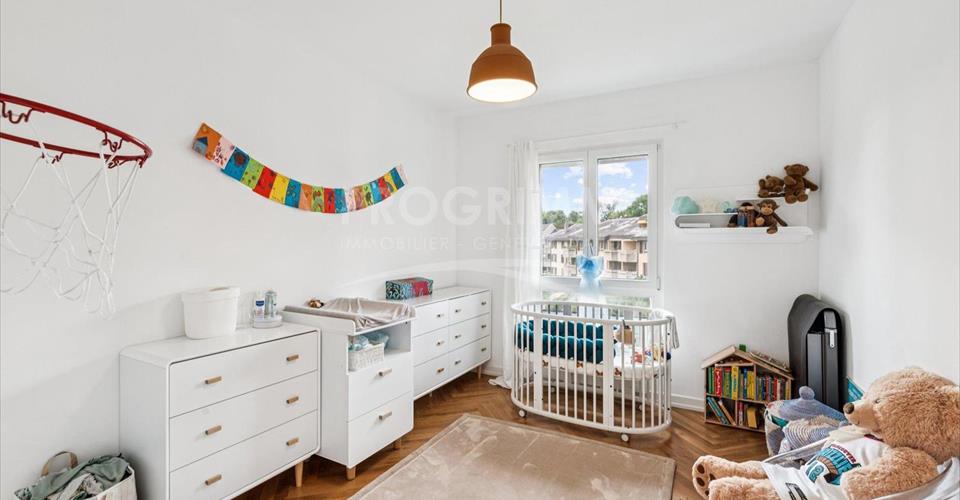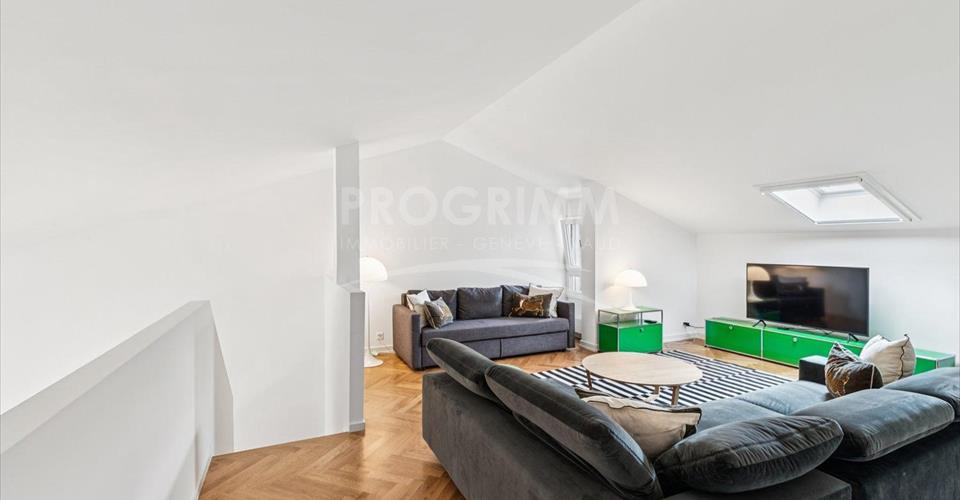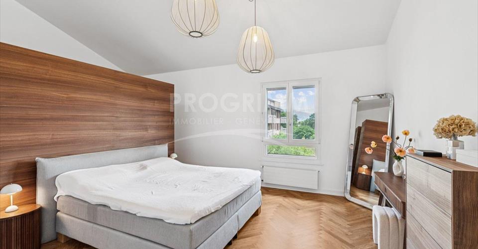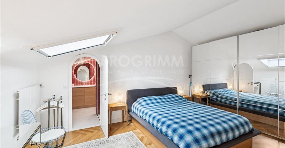 Superbe appartement, en duplex attique, situé à Cologny. Complètement rénové en 2021/2022, l’appartement possède de splendides matériaux et équipements. Il bénéficie d’une cheminée, de 2 caves et de plusieurs loggias/balcons. Cet appartement s’organise en duplex comme suit : 1er niveau : – hall d’entrée avec rangements – salon avec cheminée – spacieuse salle à manger – cuisine séparée et équipée laquelle s’organise autour d’un ilot central. – coin rangements avec colonne de buanderie – 2 grandes chambres (env.20m2) avec rangements – 1 salle de bain + toilettes – 1 grande suite parentale : – vestiaire – toilettes séparées – grande chambre – salle de douche “double” 2ème niveau (petit appartement) : – mezzanine ou bureau ou pièce pour jouer – 1 chambre – 1 salle de bain + toilettes – corridor bénéficiant de nombreux rangements S-sol : – caves de 9m2 L’appartement est très bien orienté et bénéficie d’un ensoleillement tout au long de la journée. Au calme et sans vis à vis, il offre 3 places de parking équipées d’une borne de recharge électrique. Commerces et écoles à proximité. Ligne de bus toute proche. Plus d’infos : PROGRIMM SA