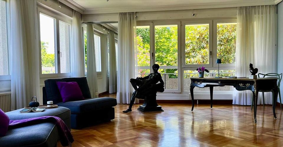 Cet appartement de 225 m² se trouve dans une résidence calme et verdoyante, nichée sur un terrain de plus de 12’000 m². Un cadre idéal pour profiter de la tranquillité tout en restant proche des Organisations Internationales, de l’Aéroport de Genève et de toutes les commodités. La résidence offre également une place de jeu entièrement équipée pour les enfants. L’espace de vie principal, baigné de lumière grâce aux grandes baies vitrées, offre une vue dégagée sur le parc environnant, ainsi que sur le Mont-Blanc et les montagnes avoisinantes. Caractéristiques de l’appartement : – Entrée principale avec WC visiteurs – Salon avec cheminée et boiseries en chêne – Séjour orienté sud-ouest – Salle à manger séparée – Cuisine entièrement équipée avec coin repas – Entrée de service avec buanderie – Couloir avec de nombreux rangements menant à la partie nuit – 4 chambres à coucher, dont une suite parentale – 3 salles de bain/douche Prestations supplémentaires : – Cave privative – Box double dans le parking souterrain, pré-équipé pour l’installation d’une borne de recharge pour voiture électrique – 22 mètres de coursive avec jardinière sur les façades sud et ouest. Cet appartement allie confort, espace et luminosité dans un environnement exceptionnel, tout en restant à proximité de toutes les commodités
