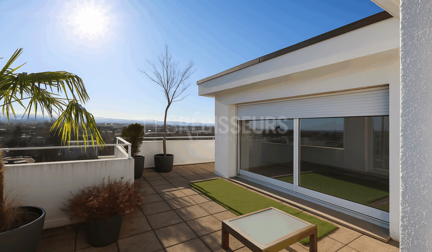 La terrasse de 119m² est un véritable écrin suspendu, offrant une vue panoramique sur Genève et les montagnes environnantes. Un cadre unique pour profiter des couchers de soleil et recevoir en toute convivialité.