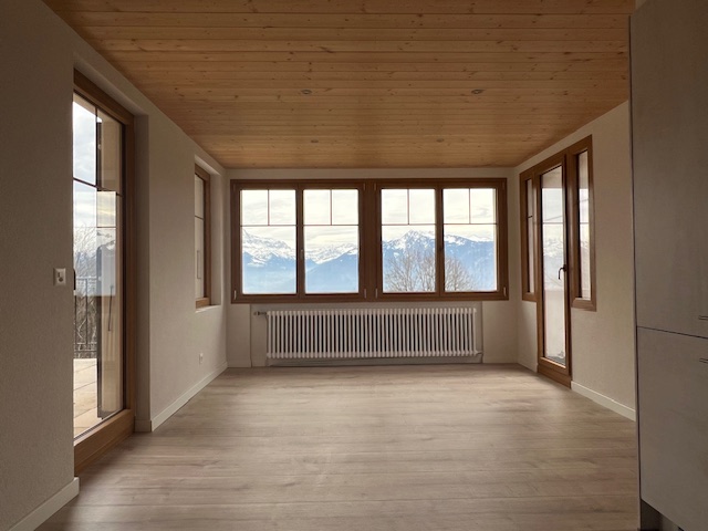 Grand appartement de 5.5 pièces sur deux niveaux répartis comme suit : Rez-de-chaussée supérieur – trois chambres à coucher dont une avec accès au balcon – couloir de desserte des chambres – salle de douche/wc neuve 1er étage – salle de bains/wc – cuisine ouverte neuve entièrement agencée avec accès à la terrasse – grande terrasse avec vue panoramique sur la plaine et les montagnes – grand couloir d’entrée et accès à une pièce qui peut faire office de coin bureau et rangement – pièce d’eau avec lavabo avec place et branchements pour lave-linge et sèch-linge – une chambre avec accès à la terrasse qui peut aussi faire office de salon Loyer : CHF 2’200.00 charges et garage compris. Grand appartement sur 2 étages dans une maison de deux logements nichée dans un havre de paix à Corbeyrier. La vue sur les montagnes et la plaine et le cadre verdoyant et très calme en font un objet qui fera le bonheur des amoureux de la nature. Lieu idéal pour télétravailler. Possibilité de disposer, à bien plaire et d’entente avec la propriétaire, d’un accès au jardin. Un garage à disposition. Aigle est à 10 minutes en voiture de Corbeyrier et le car postal dessert le village. Il dispose d’une école et d’une épicerie. Si vous êtes intéressés par la possibilité de vivre au calme tout en étant proche de toutes les commodités, n’hésitez pas à nous contacter pour une visite !