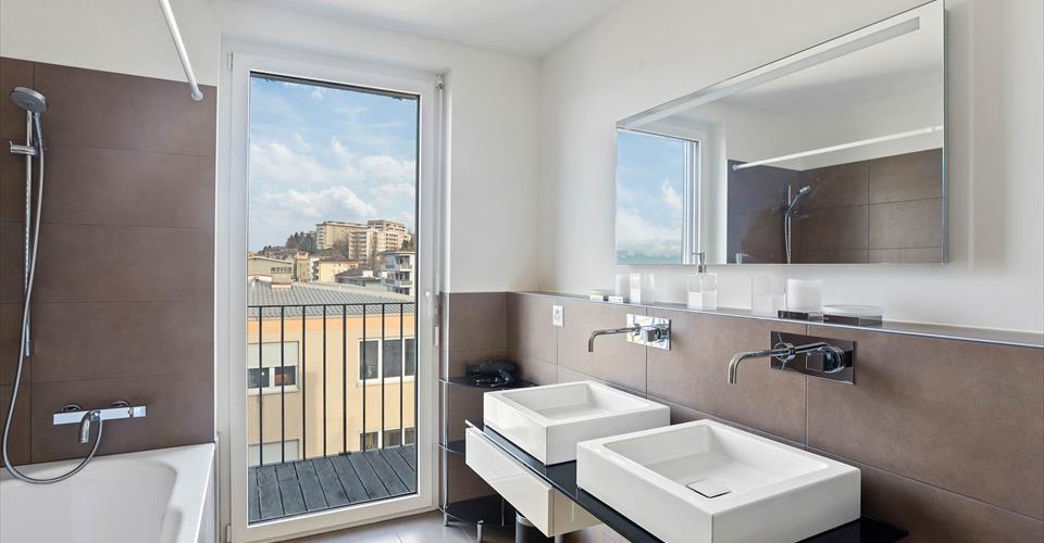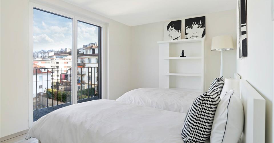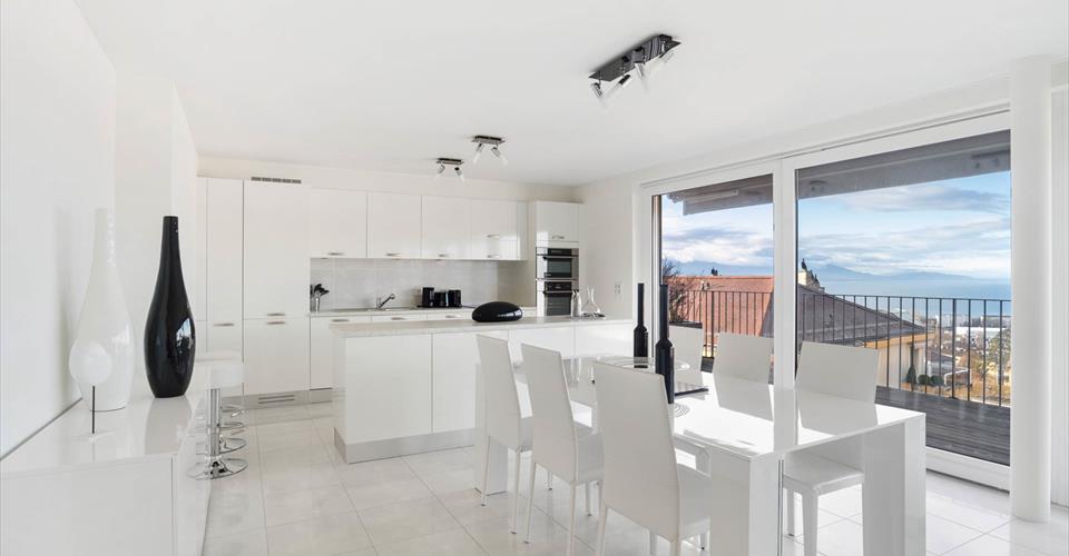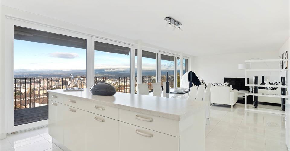 Appartement moderne avec grand balcon et vue panoramique, Une cuisine toute équipée avec îlot central, 2 chambres à coucher, Une grand terrasse, WC visiteurs, l’étage supérieur, Très lumineux, Proche des transports et des commerces.