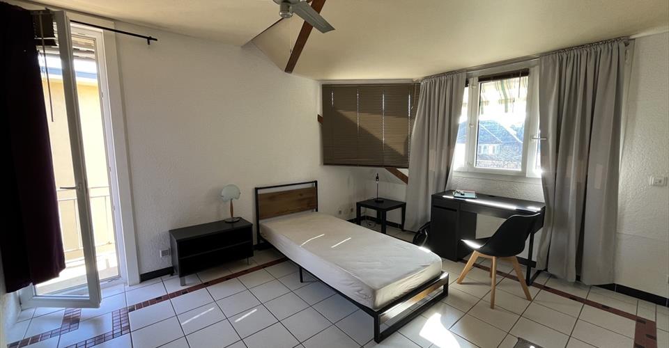 Chambre meublée en colocation située au 2ème étage d’une villa composée de deux logements Cette chambre se compose : d’une pièce principale cuisine agencée et équipée y compris ustensiles de cuisine, vaisselles, lave-linge en commun salle de douche/WC en commun Pour la visite merci de bien vouloir contacter la régie Duboux Candidature complète à adresse à Madame Ilanga à