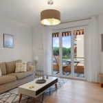 Appartement qui se compose d’un hall d’entrée avec armoires encastrées, d’une cuisine agencée, non équipée, d’un séjour avec balcon, d’une chambre à coucher et d’une salle de bains avec WC.