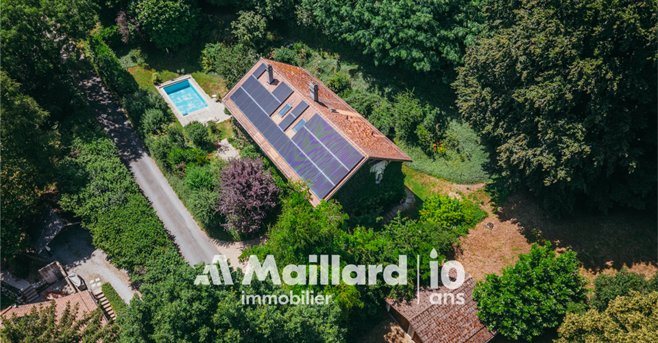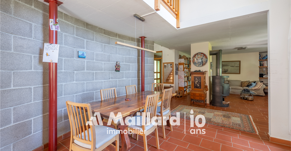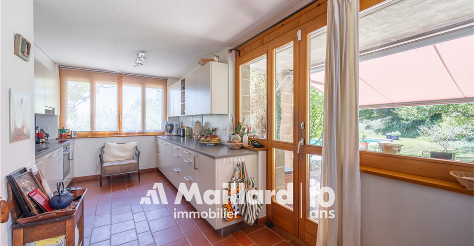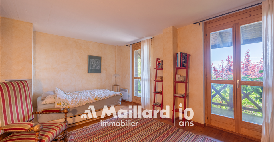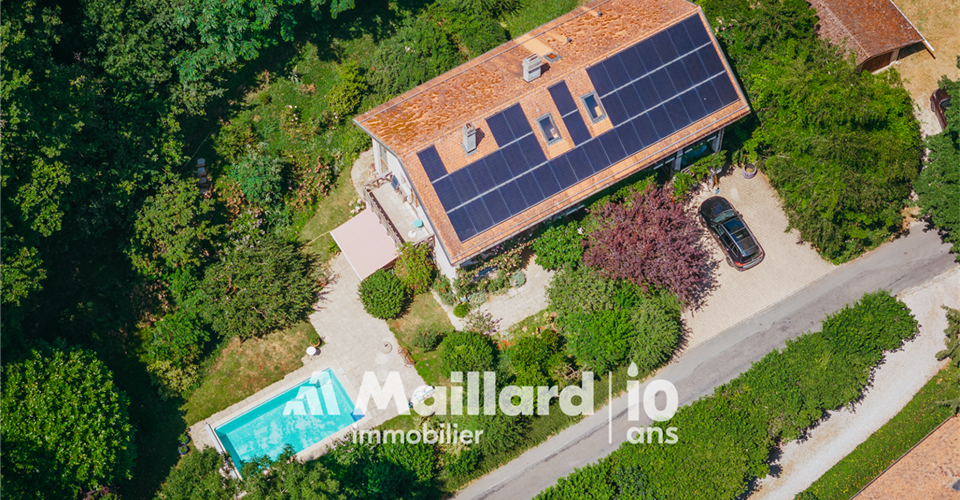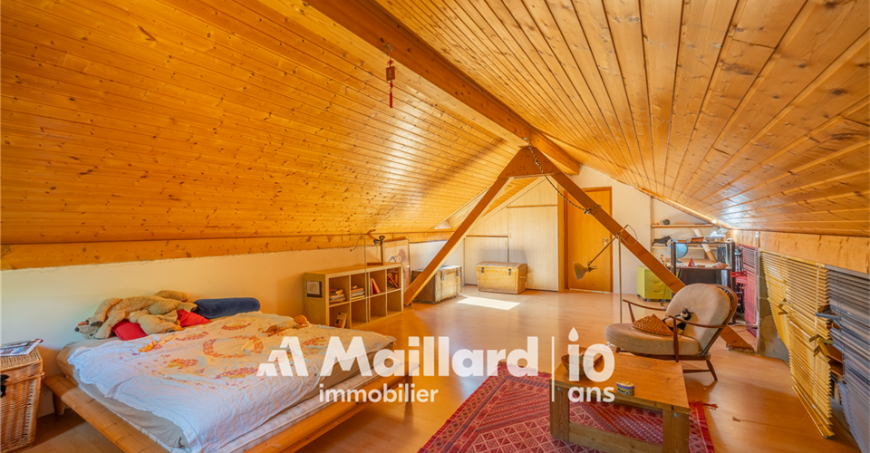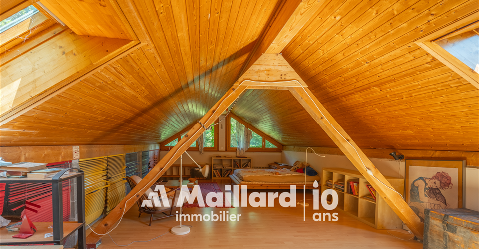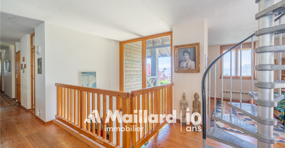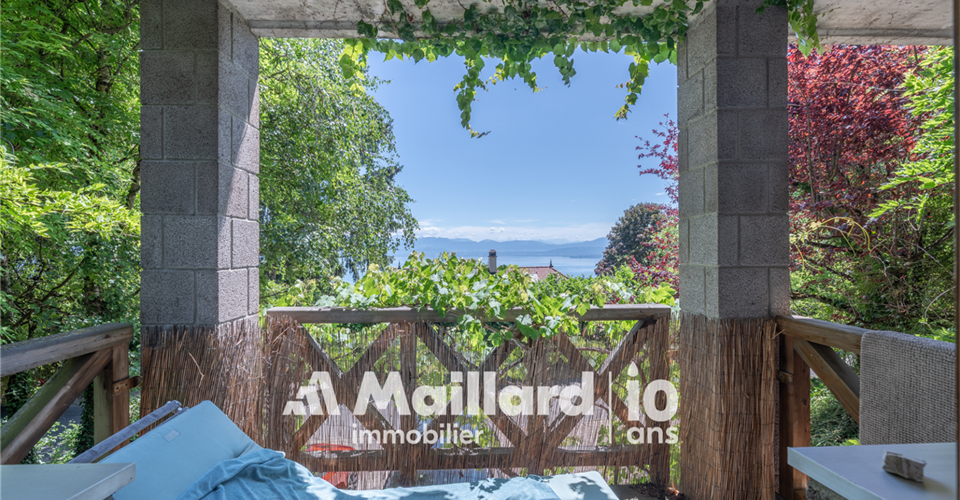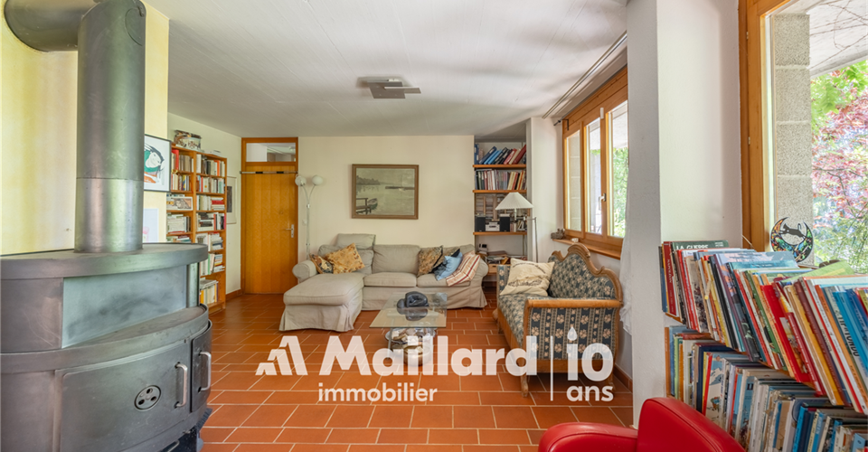 À découvrir chez MAILLARD IMMOBILIER Une perle architecturale nichée dans les hauteurs de Rolle, entre panorama, charme et sérénité. Située dans un environnement résidentiel recherché, au chemin du Croset 19, cette maison d’architecte à l’allure singulière séduit par son élégance, sa vue panoramique sur le lac Léman et son atmosphère confidentielle. Partiellement rénovée en 2019, elle s’inscrit dans un cadre verdoyant à l’abri des regards, tout en restant à proximité immédiate des commodités et des axes principaux. Avec environ 330 m² habitables répartis sur trois niveaux, cette propriété rare conjugue espace, fonctionnalité et qualité de vie. Des volumes lumineux et ouverts sur la nature Dès l’entrée, un hall spacieux vous accueille et vous conduit vers un vaste séjour inondé de lumière, une salle à manger chaleureuse et une cuisine semi-ouverte. Ces pièces de vie s’ouvrent sur un jardin arboré parfaitement entretenu, prolongé par une terrasse plein sud et une piscine, créant un véritable havre de paix. L’agencement intérieur, aux volumes généreux et aux lignes sobres, offre une atmosphère à la fois chaleureuse et élégante. Toujours au rez-de-chaussée, une chambre avec dressing et balcon bénéficie d’une vue dégagée sur le lac, apportant une touche de sérénité supplémentaire. Une salle de bains avec WC ainsi qu’un WC visiteurs complètent ce niveau. Des espaces privés pensés pour le confort À l’étage, vous découvrirez trois chambres lumineuses, toutes avec accès à un large balcon jouissant d’une vue spectaculaire sur le lac Léman et le Mont Blanc. Ce niveau est complété par une salle de bains/WC, une salle de douche/WC ainsi qu’un petit salon avec balcon donnant sur le jardin ? parfait pour une lecture au calme ou un moment de repos. Les combles accueillent une grande chambre accompagnée d’une pièce attenante : un espace idéal pour un bureau, une salle de jeux ou un atelier créatif selon vos envies. Un espace indépendant, idéal pour recevoir ou investir Le rez inférieur abrite un appartement indépendant de 2,5 pièces, comprenant une cuisinette, une salle de douche/WC et une chambre ? parfait pour accueillir des proches ou générer un revenu locatif. Une cave spacieuse et un sauna viennent enrichir ce bien rare sur le marché par sa configuration et son charme. Performance énergétique & tranquillité assurées Le chauffage électrique est en partie compensé par des panneaux photovoltaïques, couvrant environ 60 % de la consommation, complétés par un système de batteries permettant de stocker l’énergie produite pour une utilisation ultérieure, garantissant ainsi une meilleure efficacité énergétique et un impact environnemental réduit. Un cadre de vie exceptionnel à Rolle Située dans les hauteurs de Rolle, cette maison bénéficie d’un emplacement très recherché entre Genève et Lausanne, à proximité des écoles internationales, des transports, des commerces, du bord du lac et du Golf Signal de Bougy, accessible en seulement cinq minutes. Rolle séduit par son cadre de vie paisible, sa qualité résidentielle et sa proximité immédiate des grands axes, tout en offrant un calme préservé