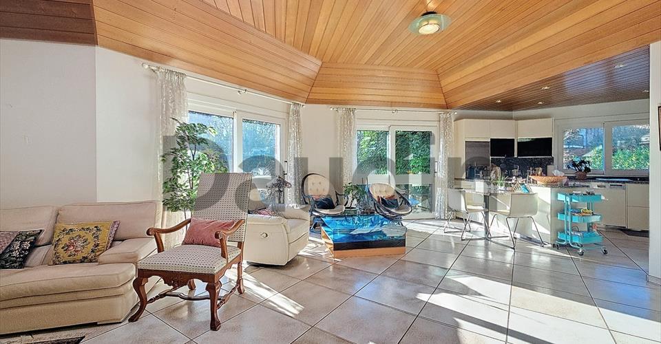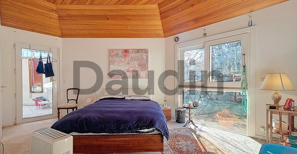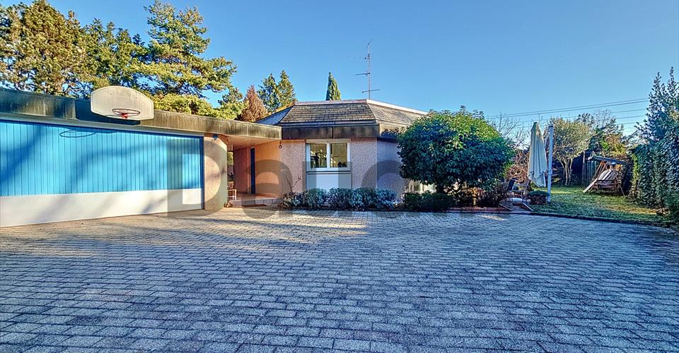 Idéalement située dans le quartier résidentiel de Chambésy, à proximité immédiate de la gare de Prégny-Chambésy et des organisations internationales, cette villa individuelle de plain-pied a été construite en 1987 sur un terrain de 776m2. Sa construction atypique lui confère beaucoup de charme et lui permet de bénéficier de généreux volumes (hauteur sous plafond d’environ 3.50m). Elle jouit d’une surface habitable brute d’environ 255m2 réparti sur un niveau. Au rez-de-chaussée, on retrouve: – Une entrée avec un espace de rangement; – Un WC visiteurs; – Un bureau – Le séjour ayant accès vers le jardin; – Une grande cuisine ouverte sur la salle à manger; – Trois chambres à coucher disposant chacune de leur propre salle de bains et WC. Au sous-sol, on retrouve: – Une grande pièce polyvalente avec de nombreux rangements; – Une salle de bains avec douche et baignoire ; – Trois chambres disposant de grandes armoires. Un garage avec porte automatique ainsi qu’une cour intérieure complètent ce bien. Charges: Estimée à environ CHF 600.-/mois de consommation de chauffage.