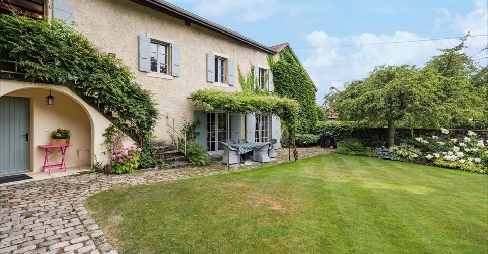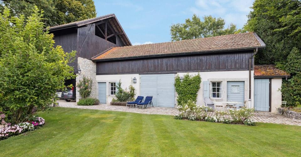 Découvrez le charme unique de ce domaine au cœur de la campagne genevoise à proximité des villages de Presinge et Puplinge ! Idéalement situé, à proximité des axes routiers et des transports en commun, il offre un accès facile au centre-ville de Genève. Cette bâtisse de caractère, transformée en résidence familiale, a préservé tout son charme au fil des années. La résidence principale de 370 m², sur un terrain principal de 3627 m², se déploie sur deux niveaux. Le rez-de-chaussée s’ouvre sur un hall accueillant, une cuisine semi-ouverte, une salle à manger lumineuse, et un salon avec cheminée, tous ouvrant sur l’extérieur. Vous trouverez également une buanderie, un cellier, des locaux techniques et une chambre avec salle d’eau. À l’étage, un vaste espace avec une hauteur sous plafond impressionnante mettant en valeur la charpente d’origine, un grand couloir dessert une première suite parentale et sa salle de bain, deux autres chambres avec placards et un bureau, une deuxième salle de bain et toilettes peuvent être reliés pour créer une deuxième suite avec un accès indépendant au jardin. La propriété comprend une grange à deux étages avec beaucoup de potentiel. Le rez-de-chaussée comprend un studio (avec salle de bains et toilettes), une pièce avec accès à une cave à vin climatisée, un atelier/rangement et un espace couvert avec parking pour 2 voitures. Le premier étage peut être rénové pour diverses utilisations. Le domaine, niché dans un écrin de verdure, offre des terrasses accueillantes et un terrain supplémentaire de 769 m² de l’autre côté de la rue.
