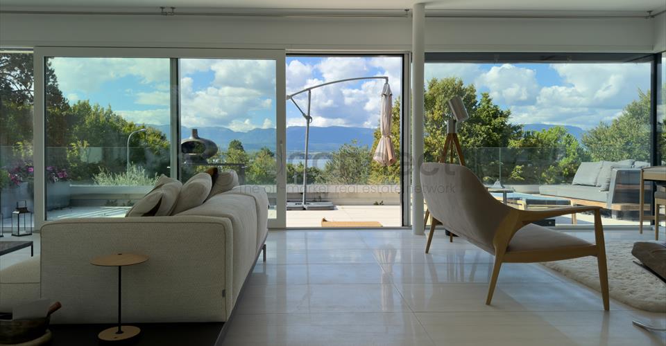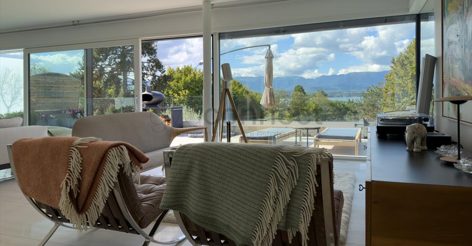 Située à Anières, à proximité immédiate de Genève et au bord du lac, cette villa moderne d’environ 400 m2 offre un cadre de vie privilégié. Son architecture contemporaine met en valeur de grands volumes, de généreuses hauteurs sous plafond et de larges baies vitrées qui apportent une luminosité exceptionnelle. Édifiée sur un terrain d’environ 800 m2, elle bénéficie d’un jardin dense sans vis-à-vis, d’une belle intimité ainsi que d’une vue sur le lac. Un ascenseur intérieur dessert tous les niveaux depuis le garage, renforçant le confort de la maison.