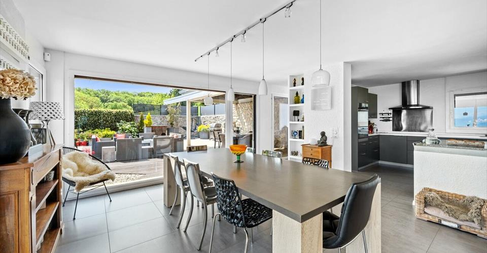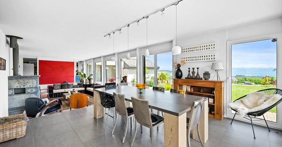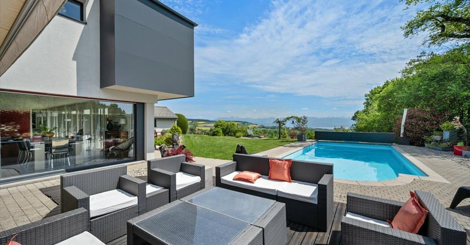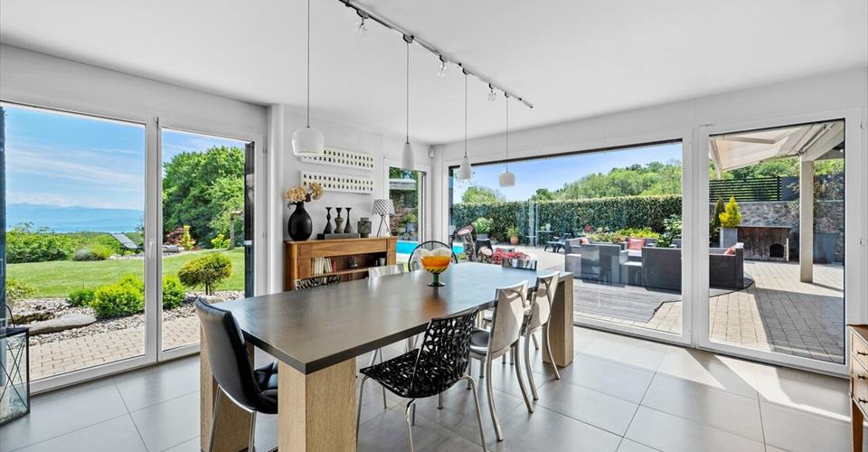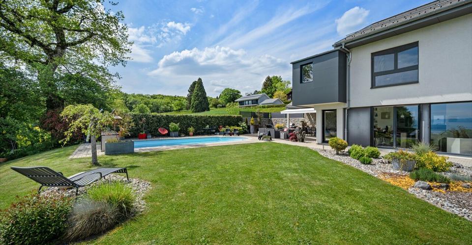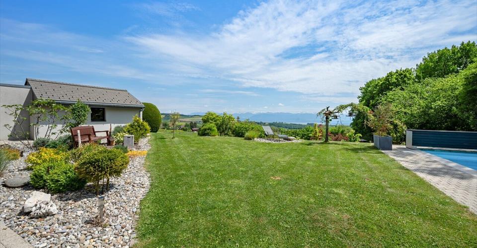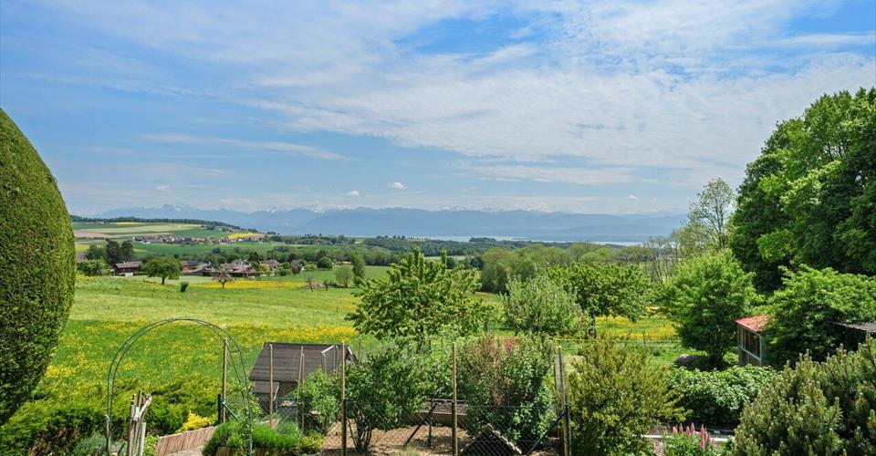 Jouissant d’une situation en pleine campagne, cette propriété est idéale pour y voir grandir vos enfants dans un environnement paisible et verdoyant. Essentiellement entourée de zones agricoles, vous bénéficierez d’un calme absolu. La situation dominante du terrain permet de contempler une belle vue sur le lac Léman et les Alpes. De construction contemporaine, cette villa fut bâtie en 2001, entretenue avec grand soin et améliorée au fil des années par les propriétaires. Accueillante et chaleureuse, elle est distribuée sur 2 niveaux. Grâce à son orientation et aux grandes baies vitrées, vous profiterez d’une belle luminosité. Les pièces de vies au rez-de-chaussée sont spacieuses et modulables selon vos envies. Ces pièces sont idéales pour y recevoir vos convives ou partager des moments en famille tout en ayant le privilège de profiter de la vue sur le lac, sur le jardin ou encore sur la piscine et la terrasse couverte. La cuisine est entièrement équipée et ouverte sur la salle à manger. L’étage du rez-de-chaussée offre d’autres avantages non négligeables, comme un salon TV, une salle de jeux, une chambre à coucher et une salle de douche. L’espace nuit principalement installé au 1er étage propose 4 chambres à coucher dont une en suite parentale avec salle de bains et dressing. En vrai maison de famille, chaque chambre à coucher bénéfice d’un dressing. Pour une vie pratique, la buanderie a été installée à ce niveau, proposant également beaucoup de rangements. Un bureau avec dressing et une 2ème salle de bains complètent ce niveau. Erigée sur une parcelle de 1406 m², la propriété jouit d’un jardin joliment aménagé aux multiples essences. La piscine et la spacieuse terrasse avec son coin barbecue sont les lieux idéaux pour vos journées et soirées d’été. Cet objet propose également un terrain supplémentaire agricole de 2625 m², en contre bas de la maison. Les propriétaires ont su faire de cet endroit, un lieu magique. En effet, vous aurez la chance de pouvoir profiter d’un potager, d’une cabane en bois avec électricité, d’un poulailler mais aussi de 2 boxes. À ce jour, deux ânes cohabitent sur ce terrain, un rêve que les propriétaires souhaitaient réaliser. L’entrée de la propriété se fait par une cour intérieure pouvant recevoir plusieurs véhicules, agrémentée d’un couvert pour 2 véhicules. Pour les amateurs de vins, une cave à vins climatisée est à disposition. Les amoureux de la nature, du calme et de la convivialité, pourront constater que cet objet réunit le confort d’une maison familiale et de bon standing, tout en ayant une qualité de vie par des extérieurs verdoyants. Unique, authentique, dans un endroit idyllique, ce bien rare est fait pour vous! Une villa qui saura vous séduire dès le pas de porte franchi ! La charmante commune de Le Vaud, réputée pour son agréable cadre de vie verdoyant est localisée au nord-est du district de Nyon et avoisine les communes de Bassins, Marchissy, Burtigny et Begnins. Sa situation dominante offre une magnifique vue sur la campagne et le massif du Mont Blanc. Ce village est très apprécié par les familles car il propose toutes les commodités et les infrastructures de première nécessité.