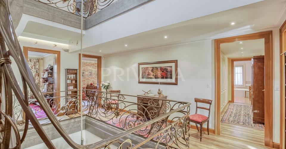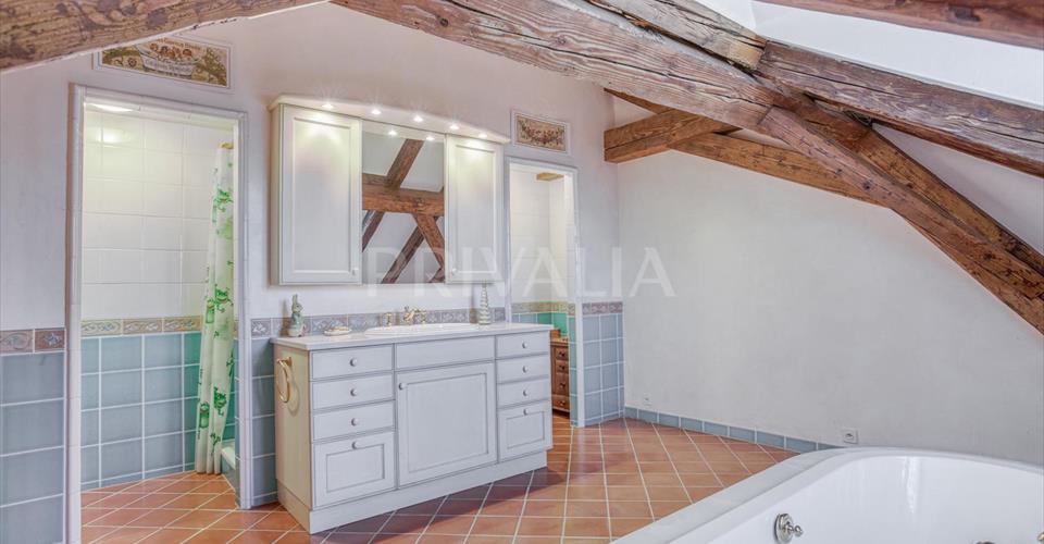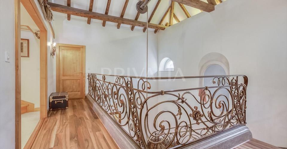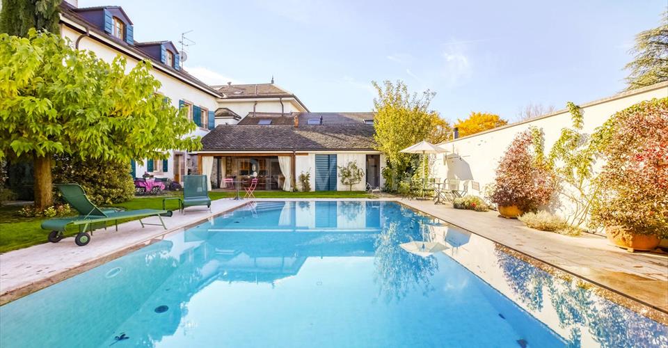 Au coeur du charmant village de Jussy, cette luxueuse demeure du début du 19ème siècle a conservé son atmosphère authentique et son charme unique. Elle comprend 11 pièces dont 5 chambres à coucher parfaitement réparties sur une surface habitable d’environ 600 m2 sur une parcelle d’environ 980 m2. Entièrement rénovée en 2000 avec des matériaux nobles et haut de gamme, elle a conservé son atmosphère authentique et son charme unique. Elle dispose d’une architecture élégante et soignée ainsi que de finitions luxueuses dont notamment, de belles hauteurs sous plafond avec d’impressionnants volumes, une superbe chambre de maître avec son salon privatif, des belles pièces de réception en enfilade, une cuisine entièrement équipée et aménagée, un majestueux poêle en céramique, du parquet en bois massif, des poutres d’époque, un somptueux escaliers escalier en noyer massif, des stores électriques, un système de sécurité complet (alarme, porte blindée et vitrage anti-effraction), ou encore un magnifique jardin comprenant une piscine à débordement et des très beaux aménagements extérieurs. Erigée sur 3 niveaux, la propriété se distribue comme suit : Rez-de-chaussée : – Hall d’entrée – Vestiaires avec WC visiteurs – Salon avec son majestueux poêle en céramique et sa bibliothèque – Salle à manger avec accès au jardin – Bureau avec porte-fenêtre sur le jardin – Cuisine équipée et agencée avec accès terrasse et jardin – Office / buanderie équipée avec lave-linge et sèche-linge 1er étage : – Chambre de maître avec son salon privé, dressing, salle de bains jacuzzi / douche / WC / double vasques en suite – Une chambre à coucher – Une salle de bains avec WC – Deux belles pièces en enfilade pouvant être utilisées comme bureau, chambre à coucher, boudoir, petit salon – Pièce polyvalente (bureau, lingerie) 2ème étage : – 2 chambres à coucher avec chacune leur salle de bains / douche / WC et dressing en suite, dont l’une avec poêle en faïence – Bureau / Atelier – Grenier avec local technique Mezzanine : Salle de jeux, pièce TV, bureau Extérieur : – Jardin fleuri et arboré – Piscine à débordement chauffée – Pool house avec vestiaires, douche et WC – Une jolie terrasse couverte avec sa cuisine d’été et son barbecue – Un magnifique jardin à la française avec fontaines – Un couvert pour 3 véhicules pouvant être fermé par une tente avec borne de charge pour véhicule électrique – Une cour fermée avec un portail électrique pouvant accueillir plusieurs véhicules Il s’agit d’un bien unique avec un charme exceptionnel offrant une excellente qualité de vie. A proximité de toutes les commodités de la région, tels que petits commerces, restaurants, écoles, bus, poste et à moins de 20 minutes du centre-ville, de l’École Internationale, de la gare des Eaux-Vives et du CEVA. Tous les frais de maintenance et entretiens tels que chaudière / chauffe-eau, portail, nettoyage des canalisations, ramonage ainsi que l’entretien partiel du jardin et de la piscine (hormis produits consommables annuels), sont compris dans le loyer. Les animaux ne sont pas admis. Charges individuelles, selon la consommation