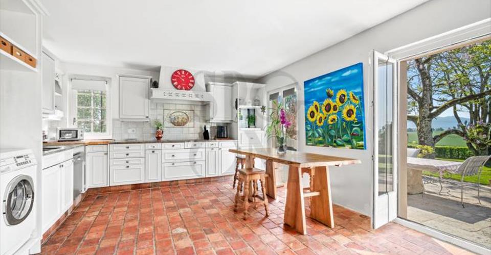 Nichée dans un écrin de verdure, cette splendide maison vaudoise, construite en 1971 et parfaitement entretenue, se trouve dans l’un des villages les plus recherchés du district de Morges. Idéalement située à quelques minutes seulement du centre de Morges, des écoles internationales, des commerces et de toutes les commodités, cette propriété combine la sérénité de la campagne et la proximité immédiate de Lausanne et Genève. Elle offre un cadre de vie unique, alliant lac et campagne, pour un quotidien paisible et raffiné. Implantée sur une parcelle de plus de 13’400 m² (en cours de division de bien-fonds et soustraction LDFR), cette propriété bénéficie d’une tranquillité absolue, d’un ensoleillement optimal ainsi que d’un environnement sans vis-à-vis. Elle dispose d’une surface utile de 580 m², répartie sur deux niveaux plus un sous-sol, offrant ainsi de généreux volumes et une distribution parfaitement optimisée. Alliant charme et confort, la maison de 12.5 pièces séduit par la qualité de ses matériaux, notamment ses poutres apparentes, ses parquets anciens, et ses sols en pierre de Bourgogne ou en briques. Elle comprend également plusieurs cheminées, créant une ambiance chaleureuse et accueillante dans les pièces de vie. Les rénovations continues, notamment au niveau de la cuisine, des salles de bains, ou encore de la toiture assurent une parfaite intégration des éléments modernes tout en préservant l’authenticité du lieu. L’architecture de la maison a été pensée pour garantir intimité et indépendance : elle est séparée en deux parties bien distinctes, chacune possédant ses propres espaces de jour et de nuit ainsi que sa propre cuisine. Ce concept permet une autonomie totale tout en offrant une configuration idéale pour une grande famille ou pour recevoir des invités. À l’extérieur, le jardin paysager est un véritable havre de paix, soigneusement entretenu et invitant à la détente. Il comprend notamment une terrasse plein sud, idéale pour profiter des journées ensoleillées. Anciennement utilisée comme domaine équestre, la propriété offre la possibilité d’aménager des boxes à chevaux à l’intérieur, si cela est souhaité. Par ailleurs, il convient de préciser qu’une procédure de division de bien-fonds et de soustraction de la parcelle au champ d’application de la loi fédérale sur le droit foncier rural est en cours. Elle permettra la mise en vente de la parcelle comme si elle n’était plus située en zone agricole.