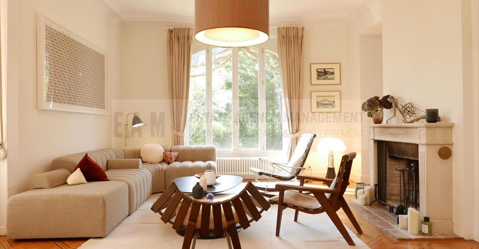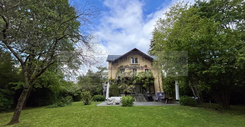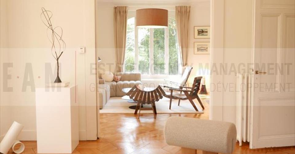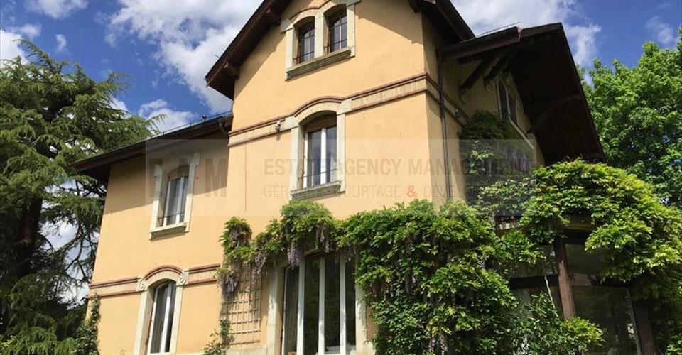 – English below – Maison de Maître édifiée sur une parcelle de près de 3000m2, à l’abri des regards et au bénéfice du charme inégalable de la vieille pierre. Raffinement et authenticité d’un autre temps. Objet rare à la vente, signé par l’architecte de renom Antoine Leclerc, cette Maison de Maître du début du XXème siècle est idéalement située au coeur de la commune prisée de Chêne-Bougeries, sur une parcelle de près de 3000m2, dans un cadre bucolique et verdoyant, orienté sud et offrant une superbe luminosité. C’est un intérieur à la fois contemporain et authentique que des architectes d’intérieur soucieux de préserver la richesse historique de ce bien d’exception ont conçu pour cette villa au cachet d’antan et au confort d’aujourd’hui. Répartie sur plus de 450m2 habitables, la demeure bénéficie d’environ 590m2 utiles et se compose comme suit: L’espace jour: une généreuse entrée, bénéficiant d’une hauteur sous plafond deux deux étages, dessert la cuisine fermée et entièrement équipée, une salle à manger ainsi qu’un double salon en enfilade avec cheminée. Ces derniers mènent à la charmante véranda offrant vue et accès à la terrasse et au jardin. Des toilettes visiteurs complètent la partie jour. L’espace nuit au premier étage offre quatre belles chambres à coucher, dont trois menant à une grande terrasse bénéficiant d’une vue magnifique côté jardin. Les 4 chambres sont complétées par une grande salle de bains ainsi qu’une salle de douche complète. Le dernier étage, mesurant plus de 100m2 en pignon, saura ravir les heureux occupants de cette chambre de maître au charme incontestable et à la vue imprenable sur le jardin de la propriété. Une salle de bain complète, un espace dressing ainsi qu’un bureau menant à la tour complètent ce dernier étage. Un sous-sol entièrement aménagé abrite une salle de sport et son sauna, un carnotzet/salle de jeux, une buanderie, les locaux techniques et sa chaudière à gaz ainsi qu’une chambre de service et salle de douche. Située à quelques minutes de l’Ecole Internationale de Genève, la propriété est également située proche du C.O. de la Florence ainsi que du Collège Claparède de Genève. Bénéficiant d’un emplacement privilégié, en retrait de l’avenue principale, au bout d’un chemin sans issue, cette propriété offre un cadre de vie verdoyant à l’abri des nuisance de la ville, tout en se situant à proximité immédiate des commodités des quartiers de Florissant, de Malagnou et du centre ville. Le jardin arboré centenaire offre une quiétude sans pareil à cet objet rare à la vente. Un garage fermé ainsi que de nombreuses places extérieures sont à disposition. Possibilités d’agrandissement. Piscinable. Dossier complet et visites sur demande. AUTHENTICITY AND LUXURY SET ON NEARLY 3000 sq.m. OF LAND, STEPS AWAY FROM DOWNTOWN EAM is pleased to offer this rare listing for sale. Dated from the early XXth century, this authentic “Maison de Maître”, designed by the renowned architect Antoine Leclerc, is ideally located on a quiet and prestigious street within the most sought-after area in the heart of Chêne-Bougeries in Geneva. The villa is spread over 450 sq.m., 590 sq.m. including the basement, and seats on a generous plot of nearly 3000 sq.m. Renovated with taste and refinement, the interior is both contemporary and authentic. This property will offer you the charm of another era while benefiting from today’s comfort. As you enter the villa, a generous entrance with a spectacular high ceiling distributes the day part: a closed and fully equipped kitchen, a spacious dining room, a double living room in a row with chimney leading to the veranda with view and access to the terrace and garden. You will access the night part on the first floor by a Renaissance style staircase leading to four generous bedrooms, three of them giving access to a stunning terrace offering an unparalleled view of the sumptuous garden. A full bathroom and a complete shower room complete this first floor. The last floor, spread over 100 sq.m., offers a completely private Master bedroom area with undeniable magic and breath-taking views of the garden. A spacious bathroom ensuite, an ensuite dressing and a study leading to the tower of the villa complete this top floor. The fully finished basement hosts a large play room/home-cinema/carnotzet, a gym corner and its shower and sauna, the laundry room, the technical room equipped with gaz heating as well as a service bedroom and bathroom. The century-old wooded garden offers unparalleled tranquillity and privacy while the villa is located minutes away from the International School of Geneva as well as the Middle School of Florence and the College Claparède. Located in a privileged location, set back from the main avenue, at the end of a cul-de-sac path shared solely by two properties, this property offers a private green living environment sheltered from the nuisances of the city, while being located in the immediate vicinity of amenities of Florissant, Malagnou and Geneva’s city center. A must see for true connoisseurs. Expansion potential including swimming-pool. Complete brochure and viewing upon request.