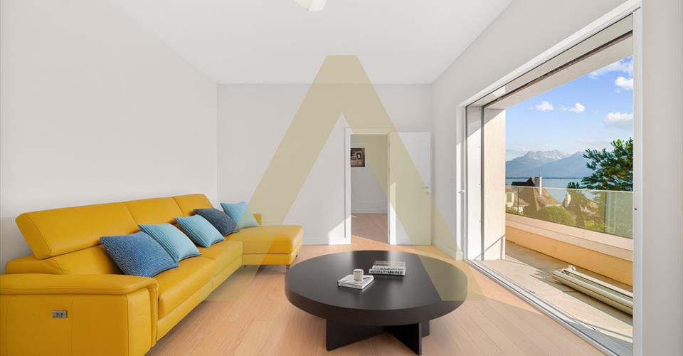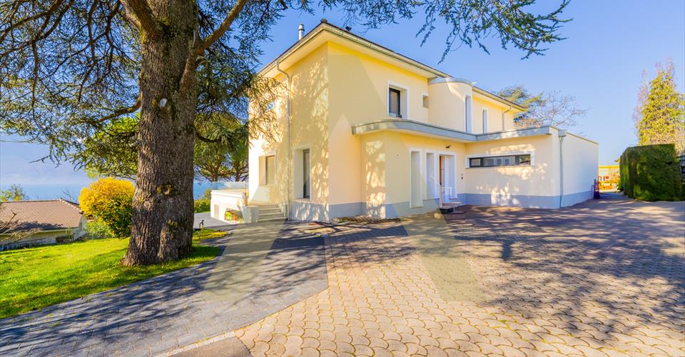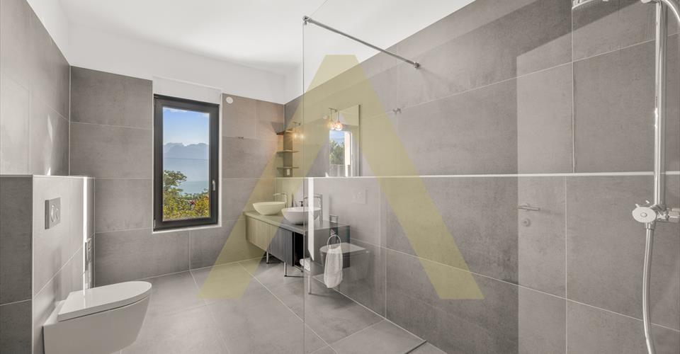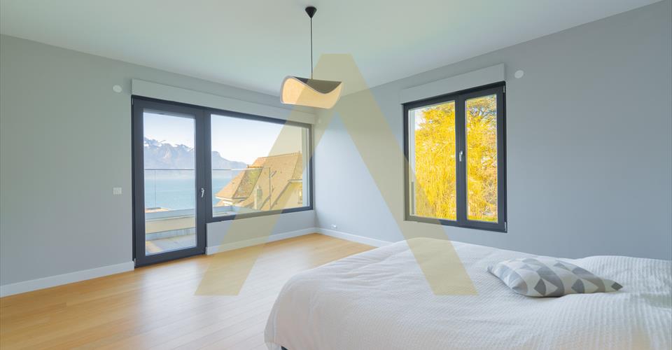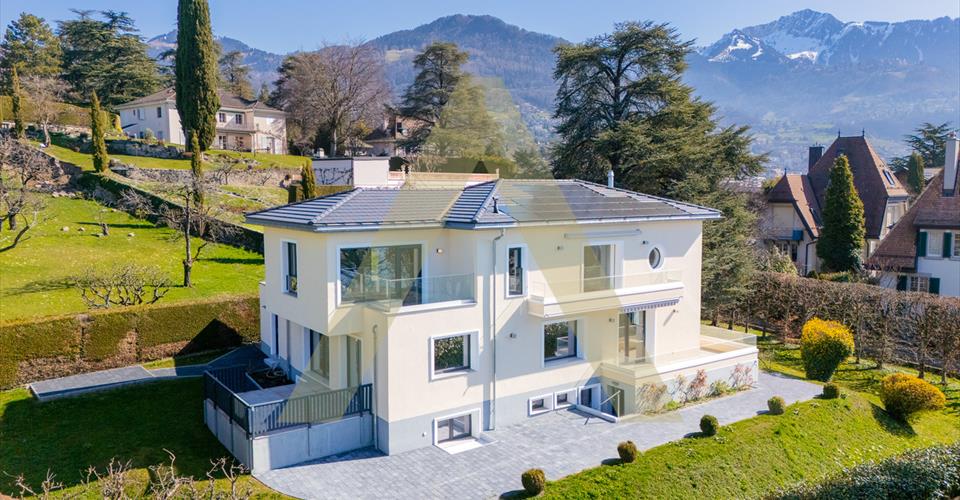 A l’entrée de Clarens, dans un quartier résidentiel de villas, face au lac et les Alpes, voici une splendide villa entièrement rénovée et transformée. De grand standing grâce à des matériaux élégamment choisis, chaque pièce bénéficie d’une importante luminosité grâce, notamment, aux grandes ouvertures vitrées. De plus, les volumes repensés de la maison se prolongent sur les extérieurs pour apprécier les vues ou échappées sur lac et la belle végétation qui entourent la maison. Le rez se compose d’un important séjour qui est en enfilade avec une cuisine moderne et totalement équipée. Depuis ces deux espaces, il est possible de rejoindre de part et d’autre de belles terrasses qui donnent sur un jardin verdoyant. Au même niveau se trouvent deux chambres et une salle de douche à l’italienne et une salle multi fonction qui pourrait avoir un usage de salle de sport. A l’étage se placent trois belles chambres à coucher dont une en suite avec dressing et salle de douche. Une seconde salle de douche et un WC visiteurs complètent ce niveau. A nouveau des balcons/terrasses permettent de profiter du calme et de la vue des Dents du Midi jusqu’au massif du Jura. En rez inférieur, avec accès intérieur et extérieur, vous trouverez une seconde cuisine dite “d’été” ainsi que trois pièces multi-usages qui pourraient faire office de chambres d’appoint, bureau, salle de jeux ou salle de home cinéma. Une salle de bains, une cave, une cave à vin et un local technique agrémentent cet étage. Un important espace extérieur permet d’accueillir de nombreux véhicules. Un atout majeur de la transformation de la villa est qu’elle a obtenu une amélioration considérable de son enveloppe et donc une efficacité énergétique globale de note A, rarissime pour une rénovation. Le chauffage par pompe à chaleur au sol et l’ensemble des panneaux solaires sur 70m2 y contribuent. Situation privilégiée car à 3minutes à pieds de l’école internationale St-Georges, la clinique La Prairie plus la Marina de Clarens et à 250m à vol d’oiseau des rives du lac, cette villa sera appréciée à sa juste valeur par une famille recherchant un lieu paisible et bien placé grâce à toutes les commodités environnantes.