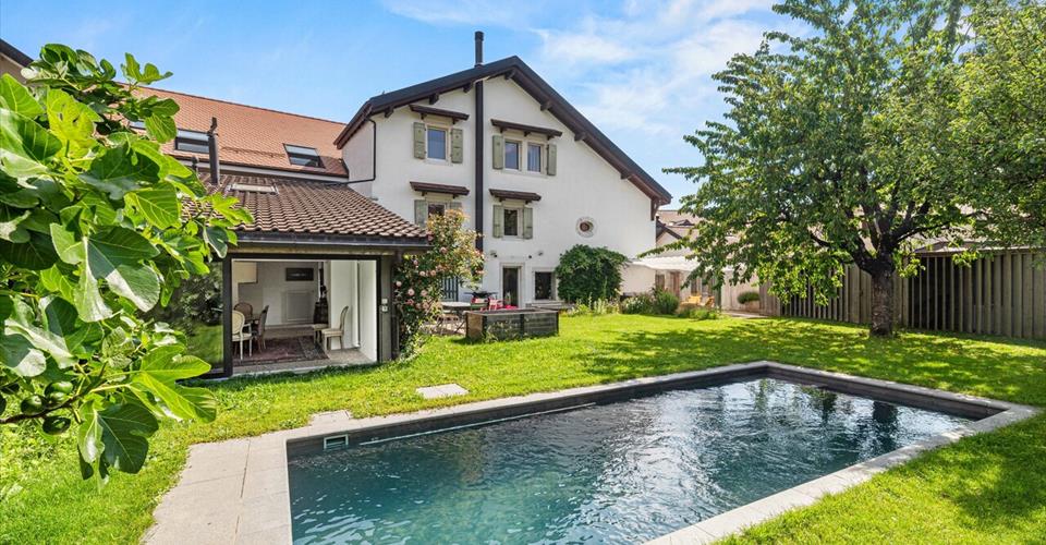 Ce magnifique corps de ferme du début du XVIIIe siècle se trouve au centre du village de Genolier. Sa situation est idéale à seulement quelques minutes de Nyon et à mi-chemin entre Genève et Lausanne. Cette situation privilégiée est renforcée par la proximité des commodités, des écoles internationales et des principaux axes routiers offrant un mélange parfait de tranquillité et d’accessibilité pour ses résidents. La propriété offre 700 m2 de surface habitable et se trouve sur une parcelle de 845 m2. Elle a été intégralement rénovée en 2007 et se compose de la maison principale, d’un magnifique loft en duplex de 3,5 pièces et d’une dépendance avec studio. Elle allie parfaitement le charme d’un bâtiment rural et un style très contemporain avec des matériaux haut de gamme, de magnifiques volumes et de larges ouvertures. La maison principale reçoit 10 pièces dont une très belle suite parentale et 4 chambres. Une pièce utilisée comme bureau est ouverte sur la rue et idéale pour une activité indépendante. La majeure partie des pièces s’ouvrent sur un charmant jardin de plus de 500 m2. Entièrement clôturé, il est agrémenté d’arbres fruitiers, de deux terrasses et d’une belle piscine extérieure. Une cour avec 3 places de parc extérieures complète ce bien d’exception.