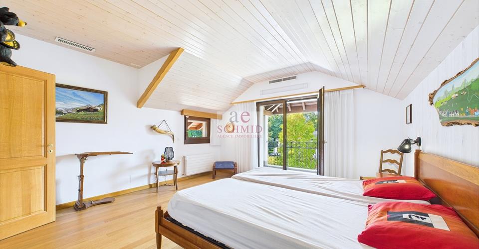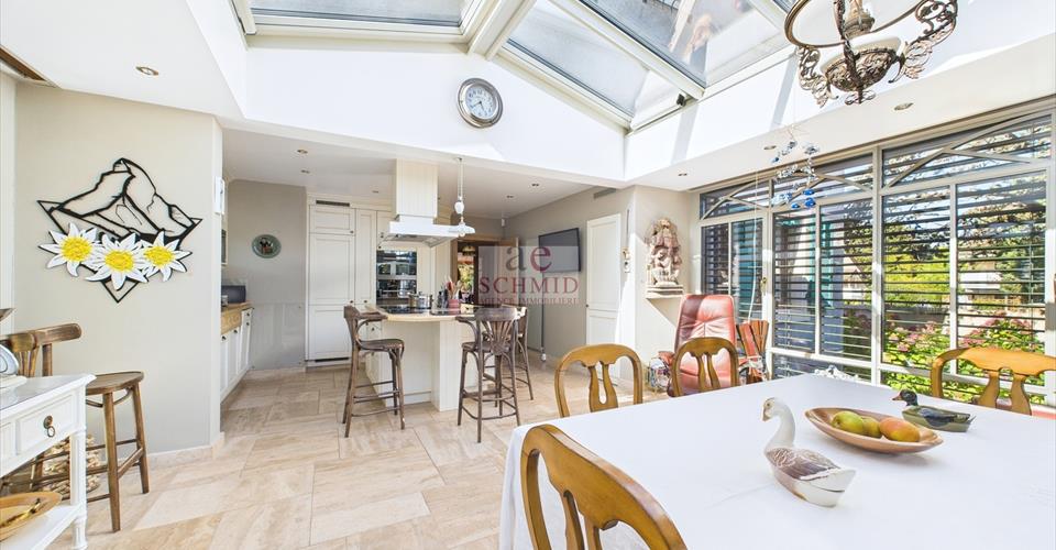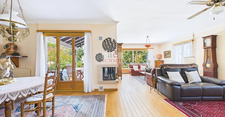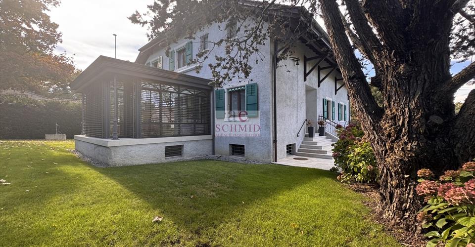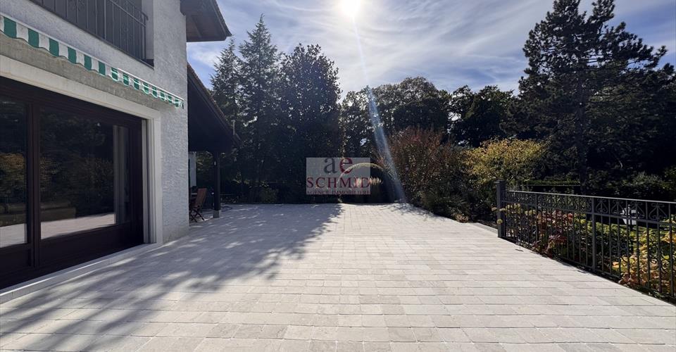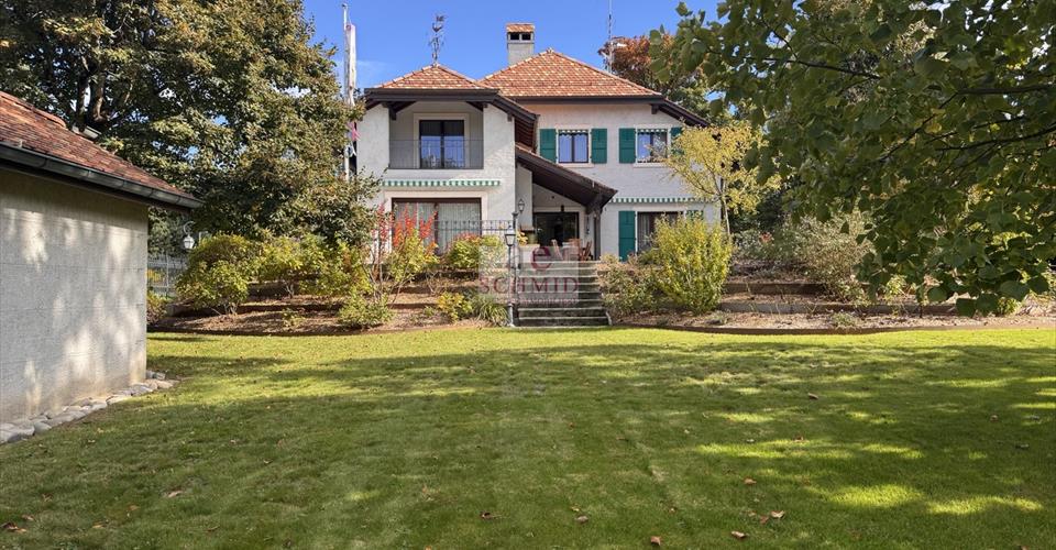 Nichée au calme au bout d’un chemin sans issue et à quelques pas du lac, cette belle propriété bénéficie d’un cadre privilégié au sein de la commune prisée de Collonge-Bellerive, qui offre toutes les commodités, écoles et une qualité de vie recherchée. Implantée sur une magnifique parcelle arborée d’environ 1’300 m², la maison, parfaitement entretenue, propose environ 526 m² utiles. Le terrain est piscinable, permettant d’ajouter un espace de détente supplémentaire selon les envies. Le rez-de-chaussée se compose d’une entrée avec vestiaire et d’un bureau. Il comprend également un WC visiteurs, ainsi qu’une spacieuse cuisine ouverte prolongée par une véranda lumineuse dotée d’un éclairage zénithal et aménagée en agréable coin repas. Le salon et la salle à manger s’ouvrent sur une vaste terrasse ensoleillée, offrant une zone repas abritée et un barbecue en pierre, parfaits pour profiter des beaux jours. La partie nuit du rez-de-chaussée comprend deux chambres ainsi qu’une salle de bain complète. À l’étage, trois suites disposent chacune d’une salle de bain complète et d’un dressing. La suite parentale, avec terrasse et vue sur le lac en hiver, se distingue par son confort et son intimité. Le sous-sol propose un garage pour deux voitures, une cave à vin climatisée, un salon tv, une salle de jeux, un atelier, des locaux de rangement et un local technique. Informations complémentaires Travaux de rénovation de la cuisine et de la véranda effectués en 2017 Panneaux photovoltaïques installés en 2025 Chauffage distribué par le sol dans la véranda et la salle de billard, et par radiateurs dans le reste de la maison Système de sécurité avec vidéosurveillance 4 places de stationnement couvertes et 3 places extérieures Bien que parfaitement entretenue, la villa nécessite une remise au goût du jour, offrant ainsi une belle opportunité de personnalisation selon les envies du futur acquéreur. Un bien idéale pour une famille recherchant espace, confort et sérénité.