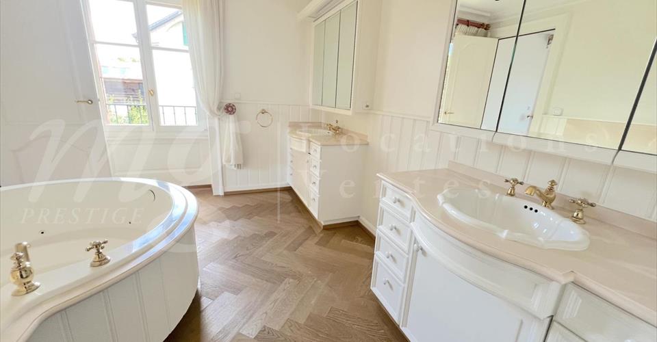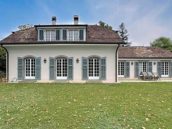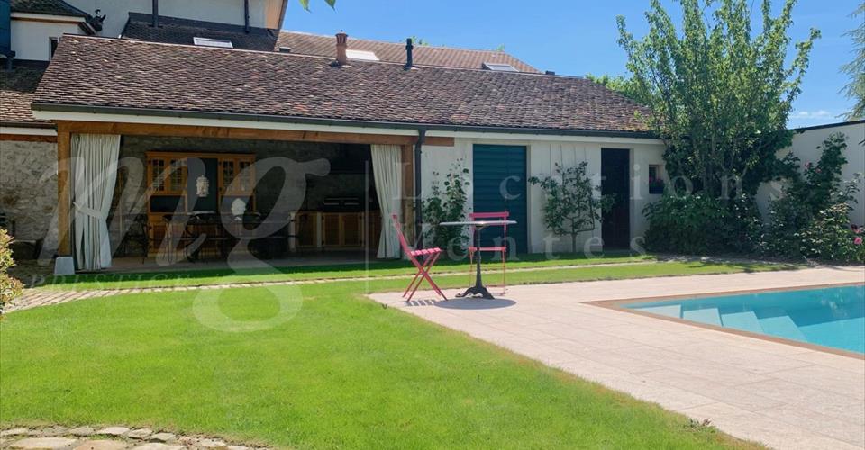 Proche du village et ses commerces, du bus et des écoles. A 10 minutes de Vesenaz SUPERBE PROPRIETE DE MAITRE DE 15 PIECES 600 m2 env – 8 chambres à coucher – bureau et 3 pièces de réceptions – baignoire balneo RAVISSANT JARDIN ARBORE ET PRIVATIF GRANDE PISCINE ET CLUB HOUSE AMENAGE AVEC CUISINE & BBQ Grandes pièces – Elegante – Beaucoup de charme – Belle hauteur de plafonds – Poutres apparentes – Très beaux parquets – Rez : Large hall d’entrée, vestiaire et wc invités, superbes réceptions avec belles hauteurs de plafonds, – 1x vaste salon avec poêle, – 1x large salle à manger séparée, – 1x salon TV et bureau, – très grande cuisine entièrement équipée familiale avec espace pour table familiale et ilôt central & office 1er : – 1x chambre parentale avec coin salon TV, grand dressing, salle de bains avec douche et baignoire balnéo en suite. – 1x grande chambre avec dressing et salle de bains en suite. – 1x chambre – 2x chambres communicantes 2ème : – 2x chambres avec chacune armoires et grandes salle de bains douche en suite chacune – 1x chambre, grand dressing, – 1x mezzanine /salon TV/salle de jeux. – Couvert pour 2 voitures dans la cour intérieure & Places de parc