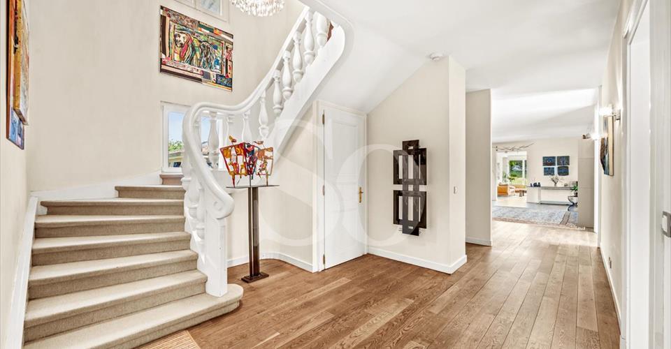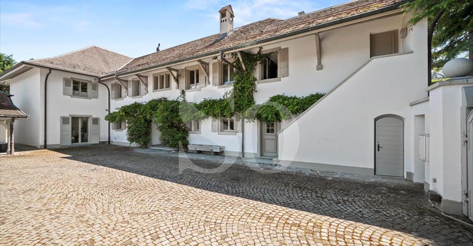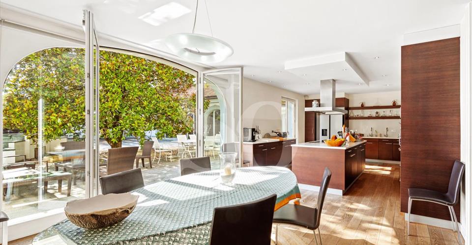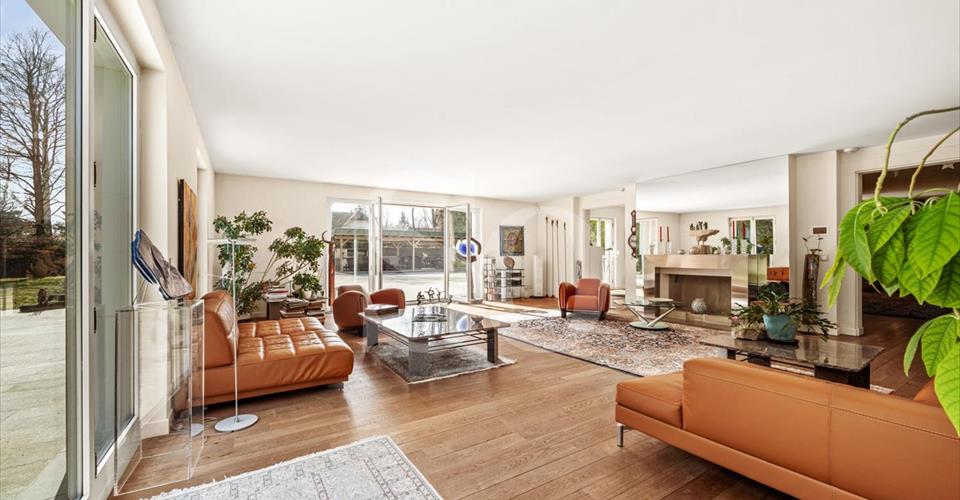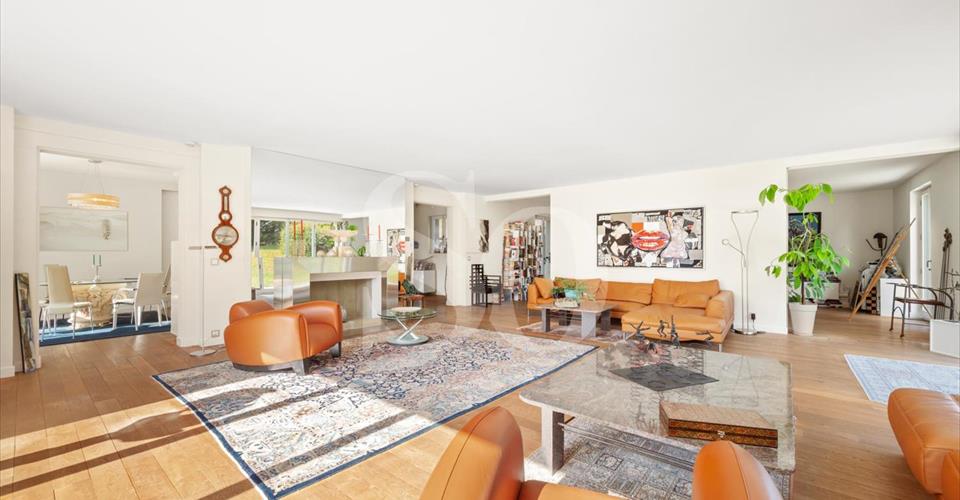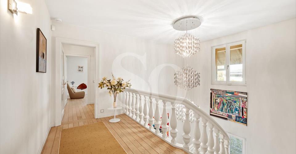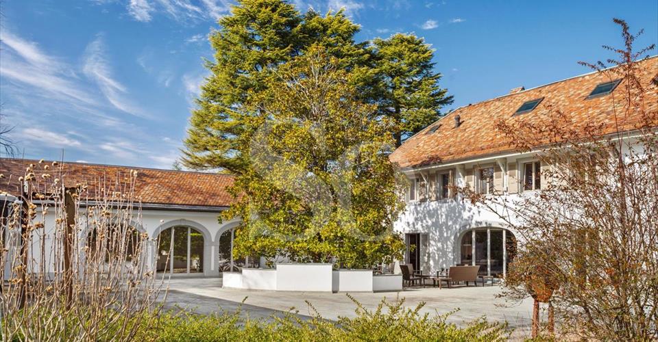 Idéalement située au centre de la commune prisée de Crans, cette belle propriété familiale est implantée sur une parcelle exceptionnelle de 4 979m², offrant un cadre de vie intime et préservé. Entourée de magnifiques arbres et bénéficiant d’une absence totale de vis-à-vis, elle incarne un havre paisible au sein d’un environnement verdoyant. Construite en 1947 et rénovée en 2014, cette demeure de 471m² habitables, se distingue par ses généreux volumes et son ambiance chaleureuse, idéale pour une famille. Sa configuration spacieuse et son vaste terrain en font un lieu de vie sans comparable. En franchissant le portail, une charmante cour pavée dévoile l’authenticité des lieux, tandis qu’une entrée ornée de glycine invite à découvrir cette magnifique demeure. Le rez-de-chaussée s’ouvre sur un vaste hall baigné de lumière, posant d’emblée l’atmosphère accueillante de la maison. Un salon aux volumes généreux se prolonge par un bureau attenant, offrant une parfaite combinaison entre espace de détente et de travail. Plus loin, la salle à manger en enfilade et une cuisine familiale, agrémentée d’un coin repas, forment des espaces de vie lumineux et conviviaux. Toutes ces pièces s’ouvrent harmonieusement sur une grande terrasse, qui surplombe le parc verdoyant et invite à profiter de l’extérieur en toute quiétude. À l’étage, l’espace nuit se déploie avec élégance. Un couloir spacieux dessert cinq chambres, chacune agrémentée de sa salle de bain privative, offrant confort et intimité à chaque membre de la famille. La suite parentale, d’une générosité remarquable, comprend un bureau, un dressing et une salle de bain, créant un véritable sanctuaire personnel. Les combles aménagées ajoutent une dimension supplémentaire à la maison, avec un salon dédié aux loisirs, une grande pièce polyvalente idéale pour une salle de jeux ou un espace détente, et une salle d’eau supplémentaire. Attenant à la maison, un espace bien-être complète l’ensemble. Il comprend une piscine chauffée, un hammam, une douche, et une salle de sport, parfait pour des moments de relaxation et d’entretien physique. Un studio indépendant avec cuisine et salle de bain offre une solution pratique pour accueillir des invités ou du personnel. Une autre annexe, indépendante, permet de stationner deux véhicules à l’abri. Avec un droit à bâtir résiduel, cette propriété présente un potentiel d’agrandissement ou de personnalisation supplémentaire, un atout rare dans la région. Alliant volumes généreux, cadre verdoyant et localisation centrale, cette demeure familiale offre une opportunité unique de profiter d’un cadre de vie serein et préservé.