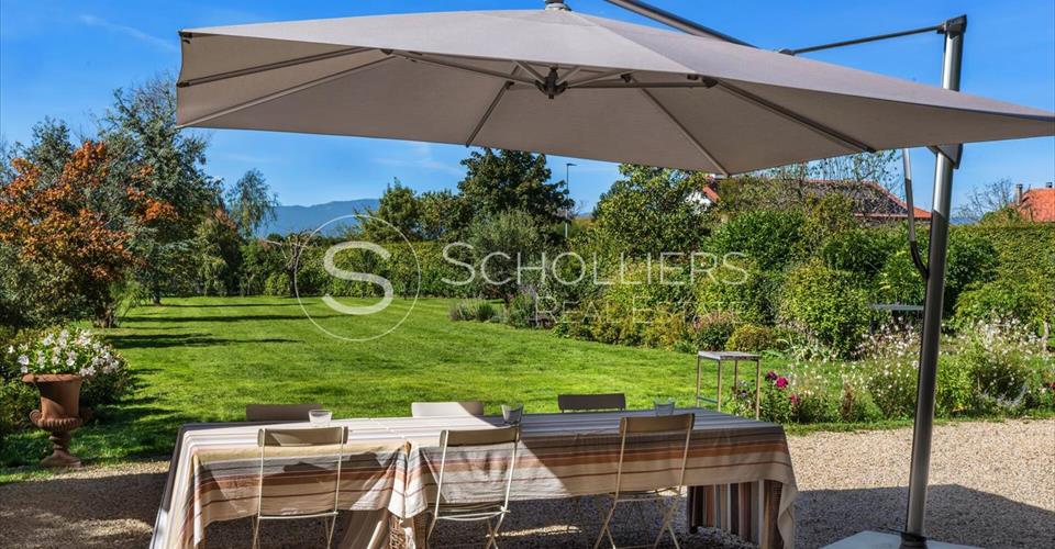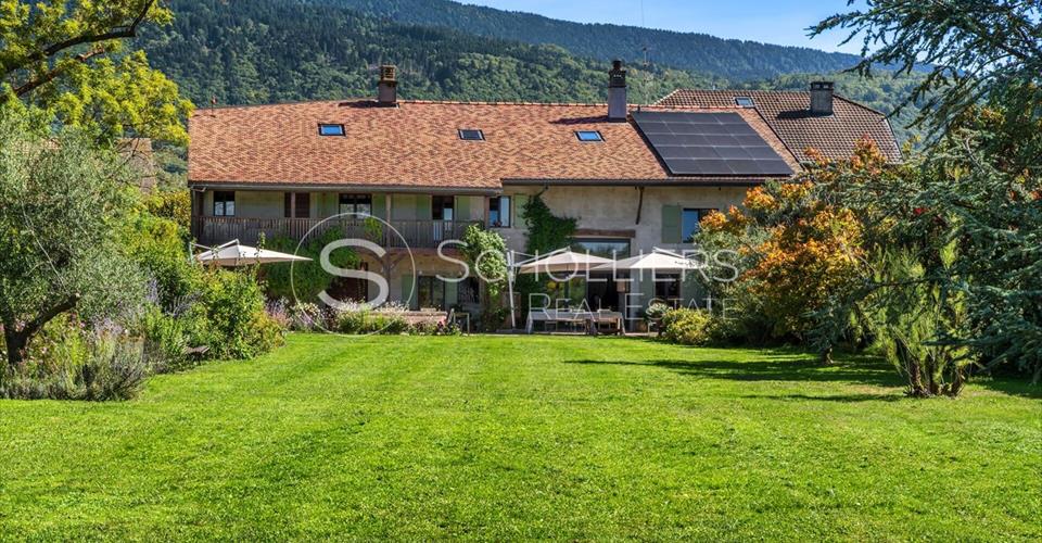 Jussy À proximité immédiate du village de Jussy, au sein d’un hameau calme et verdoyant, cette superbe demeure familiale de 20 pièces (7 chambres) séduit par son atmosphère raffinée, la qualité de sa rénovation et la générosité de ses volumes. Offrant près de 650 m² habitables pour une surface utile équivalente, elle a été entièrement repensée en 2022 avec des matériaux haut de gamme et des technologies modernes, dans le respect de son caractère d’origine. Dès l’entrée, un vaste hall avec vestiaire et toilettes visiteurs mène à un somptueux séjour à plafond cathédrale, agrémenté d’une cheminée contemporaine et d’une cave à vins vitrée intégrée au sol. La cuisine semi-professionnelle, dotée d’un îlot central, s’ouvre sur une élégante salle à manger conviviale. Un bureau avec accès indépendant ainsi que de nombreux rangements complètent ce niveau. L’étage supérieur abrite une splendide suite parentale avec dressing et salle de bains incluant une double douche, deux chambres supplémentaires dont une avec salle d’eau privative, une bibliothèque ouvrant sur le balcon et une buanderie équipée. Un appartement indépendant, composé d’un salon, d’une kitchenette, d’une chambre et d’une salle de bains, complète cet étage. Les combles aménagés offrent un espace de vie supplémentaire comprenant une salle de fitness, trois chambres avec dressings et salles d’eau privatives – dont une suite avec salle de douche attenante – parfaites pour une grande famille ou des invités. À l’extérieur, la propriété s’étend sur une magnifique parcelle paysagère de 4’496 m². Le jardin, soigneusement entretenu, comprend un potager, une vaste terrasse à l’abri des regards, un local de rangement, un garage fermé et plusieurs places de stationnement. Le grenier propose encore un potentiel d’aménagement selon les envies du futur propriétaire. Avec ses 7 chambres, 6 salles de bains et ses généreux volumes, cette demeure d’exception marie avec élégance authenticité, confort et innovation. Un véritable havre de paix à seulement quelques minutes de Genève.