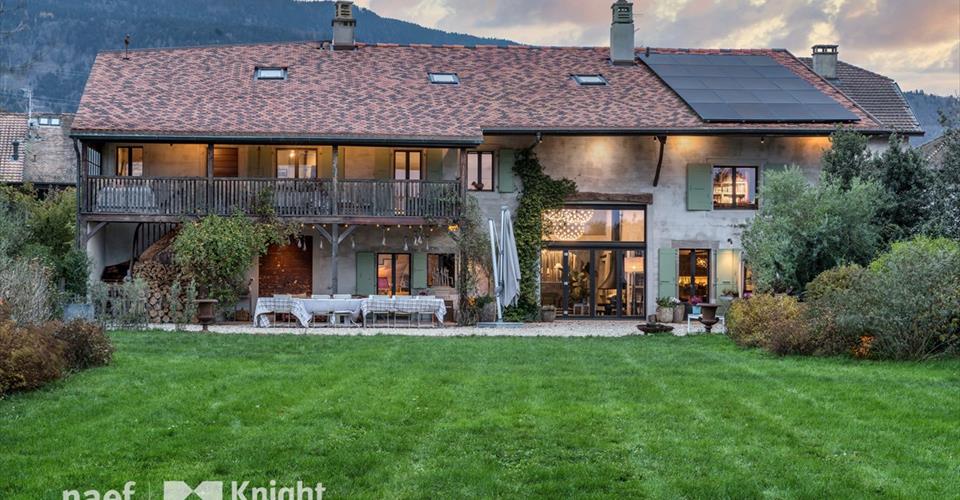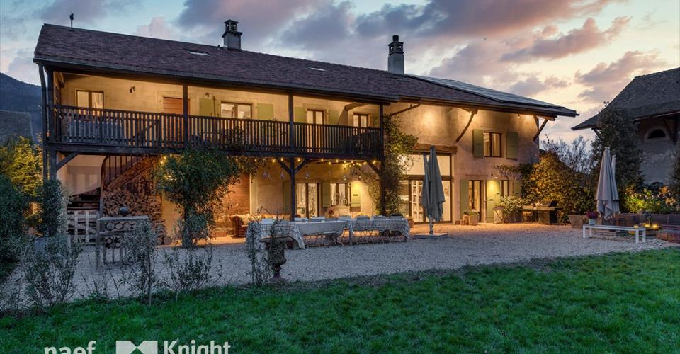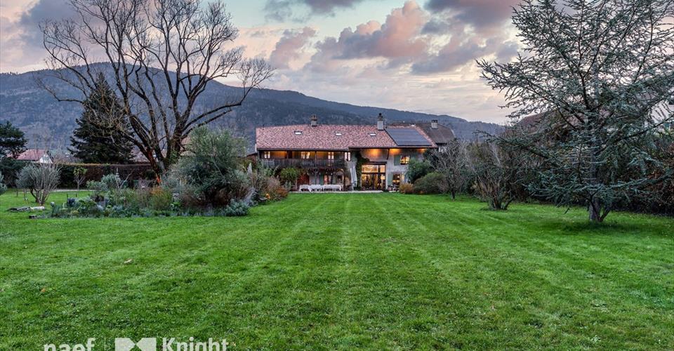 Nichée dans un charmant hameau suisse, à proximité immédiate du village de Jussy, cette superbe demeure rénovée en 2022, séduit par la qualité exceptionnelle de ses travaux, ses généreux volumes et son cadre idyllique. Entièrement équipée de domotique, d’un système de home cinéma et d’un audio system Sonos intégré, cette propriété offre un confort moderne et luxueux. Rez-de-chaussée : Ce niveau propose un hall d’entrée accueillant avec vestiaire et toilettes visiteurs, un spacieux séjour doté d’un plafond cathédrale, d’une cheminée moderne et d’une cave à vins en transparence visible au sol. Une cuisine semi-professionnelle équipée avec un îlot central, une salle à manger, un bureau avec entrée indépendante, ainsi que de multiples espaces de rangement viennent compléter cet étage. Premier étage : L’étage comprend une suite parentale avec dressing et salle de bains incluant une double douche, deux chambres à coucher (dont une avec salle de douche privative), une bibliothèque avec accès au balcon, ainsi qu’une buanderie équipée de toilettes séparées. Un appartement indépendant se trouve également à ce niveau. Il dispose d’une kitchenette, d’un salon, d’une salle de bains, de toilettes visiteurs et d’une chambre. Combles aménagés : Les combles, entièrement repensés, abritent une salle de fitness, deux chambres à coucher avec dressings, deux salles de douche et une chambre supplémentaire avec dressing et salle de douche attenante. Extérieur : L’extérieur soigneusement aménagé inclut un jardin paysager agrémenté d’un potager, une grande terrasse à l’abri des regards, un local de rangement, un garage fermé pour un véhicule, ainsi que plusieurs places de stationnement. En outre, le grenier propose un espace supplémentaire pouvant être aménagé selon les préférences de l’acheteur. Alliant charme ancien et technologies modernes, cette propriété est un véritable coup de coeur pour les amateurs de demeures rénovées avec élégance et raffinement.