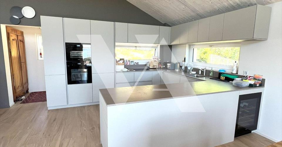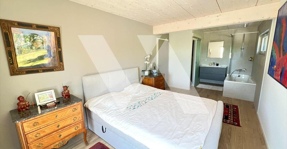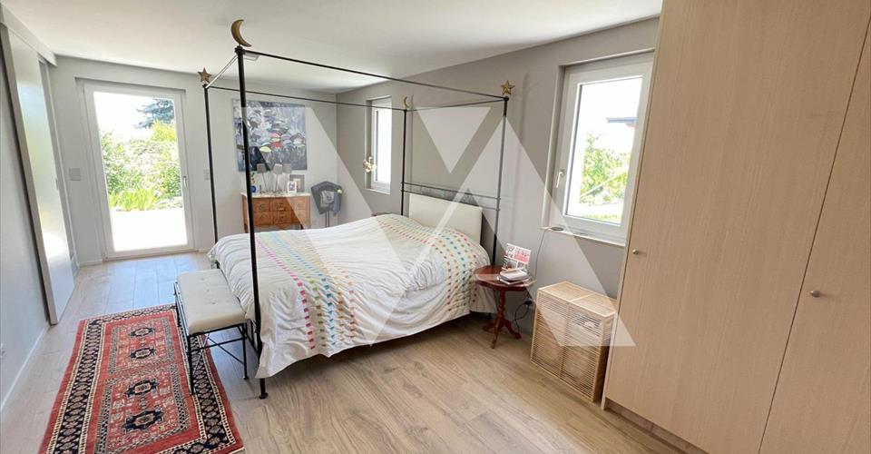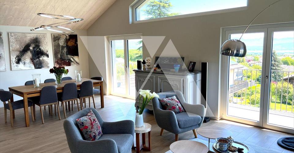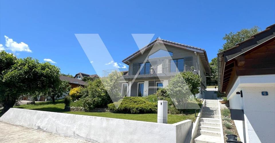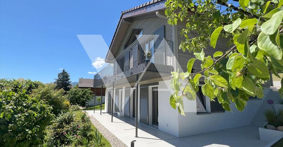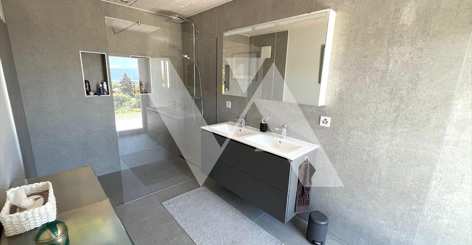 Située au bout d’un chemin privé dans un quartier résidentiel de Genolier, cette belle villa bénéficie d’un calme absolu et d’une vue imprenable sur le lac et les Alpes. Implantée sur une parcelle arborée de 1’000 m² orientée sud, elle offre un ensoleillement optimal tout au long de l’année. Organisée en duplex inversé, la villa allie élégance moderne, grande luminosité et excellentes performances énergétiques, avec des espaces ouverts sur l’extérieur pour une vie au plus près de la nature. Elle se compose de la manière suivante : Rez supérieur : – Vaste séjour/salle à manger avec cuisine ouverte entièrement équipée – Accès direct à une grande terrasse et à un balcon avec vue sur le lac et les Alpes – Hall d’entrée – WC visiteurs Rez inférieur : – Suite parentale avec dressing, salle d’eau (douche à l’italienne) et WC séparé – Deuxième chambre avec salle de bain ouverte et WC indépendant – Bureau (possibilité de créer une 3ème chambre) Extérieurs : – Magnifique jardin arboré – Deux grandes terrasses – Dépendance avec garage double et combles aménagées (atelier/rangement/dressing) – Places de parking extérieures Une opportunité rare pour les amateurs de tranquillité, de vues spectaculaires et de confort moderne. Contactez nous dès maintenant pour obtenir plus d’informations ou pour organiser une visite. Nous serons ravis de vous accompagner ! ——————————————————————————————————————————– Located at the end of a private road in a residential neighborhood of Genolier, this elegant villa enjoys absolute tranquility and breathtaking views of the lake and the Alps. Nestled on a beautifully landscaped, south-facing plot of 1,000 m², it benefits from optimal sunlight throughout the year. Designed as an inverted duplex, the villa seamlessly combines modern elegance, abundant natural light, and excellent energy efficiency. Its open-plan layout invites a harmonious indoor-outdoor lifestyle, perfectly attuned to nature. The property is arranged as follows: Upper Level: – Spacious living and dining area with a fully equipped open kitchen – Direct access to a large terrace and a balcony offering panoramic views of the lake and the Alps – Entrance hall – Guest WC Lower Level: – Master suite with walk-in wardrobe, en-suite bathroom featuring an Italian-style shower, and separate WC – Second bedroom with open-plan bathroom and independent WC – Office (with the potential to create a third bedroom) Outdoor Areas: – Beautifully landscaped garden with mature trees – Two expansive terraces – Outbuilding with double garage and converted attic (ideal as a workshop, storage space, or dressing room) – Additional outdoor parking spaces A rare opportunity for those seeking peace, exceptional views, and contemporary comfort. Contact us today for more information or to arrange a viewing. We will be delighted to assist you.