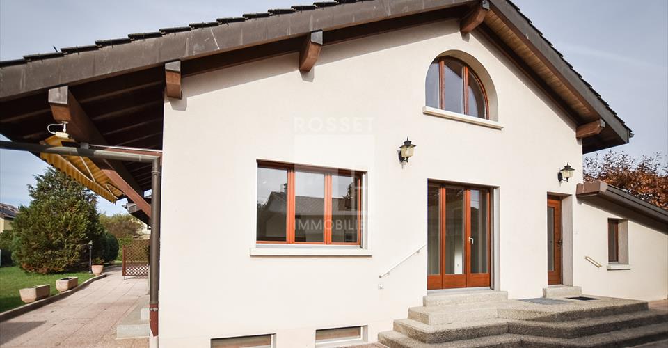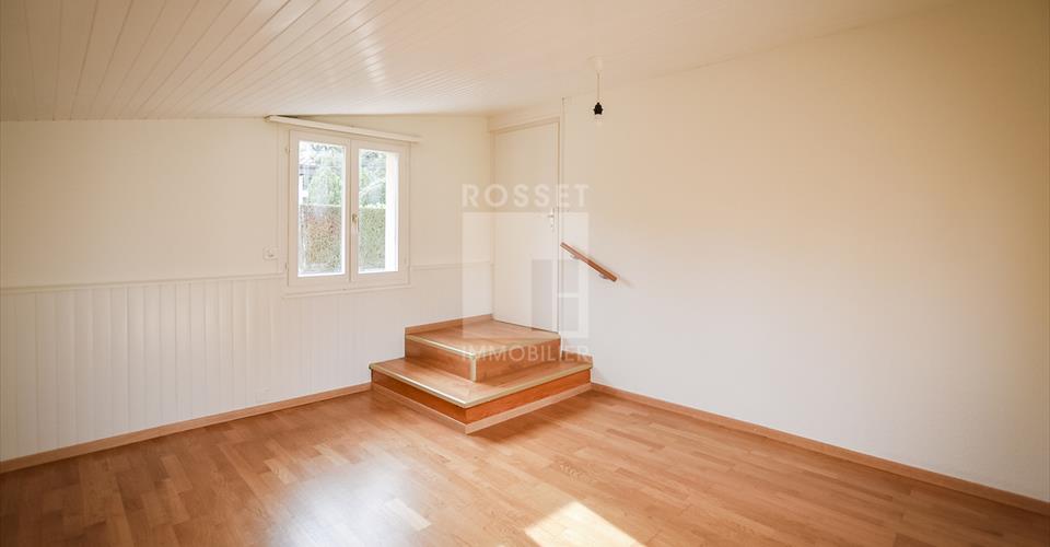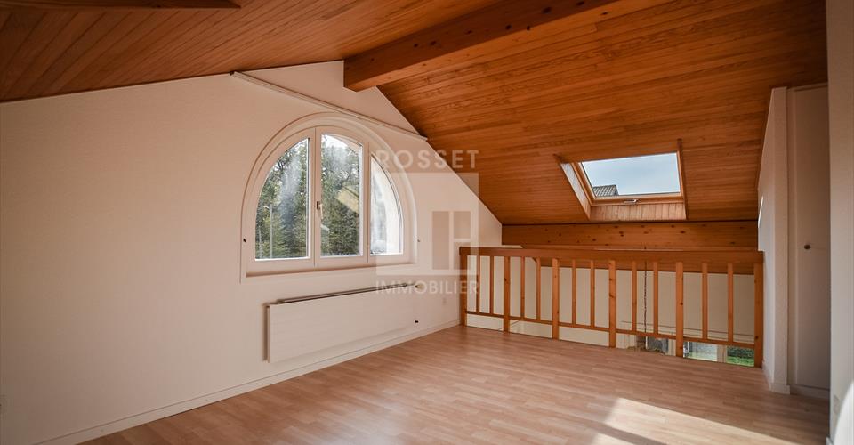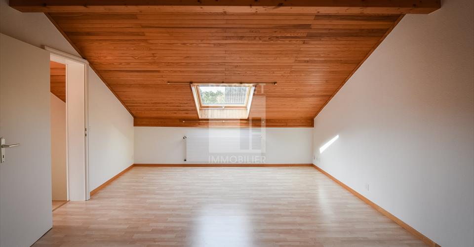 Agréable villa mitoyenne d’environ 100m2 habitables, plus d’un sous-sol. La maison offre un cadre calme et lumineux. Sa surface est répartie sur trois niveaux, le rez-de-chaussée, l’étage et le sous-sol. La maison se compose comme suit: Au rez-de-chaussée, un hall d’entrée desservant une chambre, une salle de bain/WC et une pièce avec cuisine équipée ouverte sur le séjour/salle à manger avec cheminée et portes fenêtres donnant sur la terrasse. A l’étage, une chambre sous les combles avec poutres apparentes et velux ainsi qu’une salle de douches/WC séparée et une mezzanine. Le sous-sol abrite une salle de jeux chauffée, accompagnée d’une salle de douche/WC/buanderie et d’un abri PC. A l’extérieur, une terrasse et deux places de parking extérieures complètent ce bien.