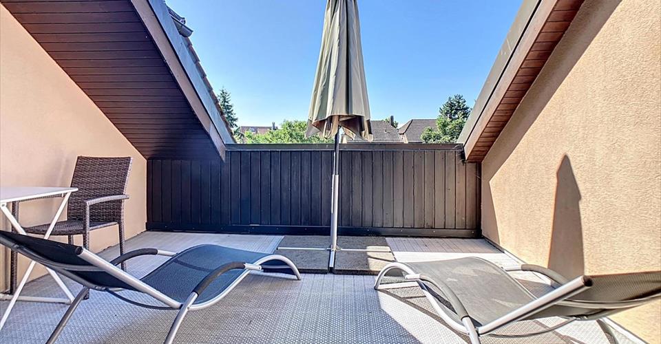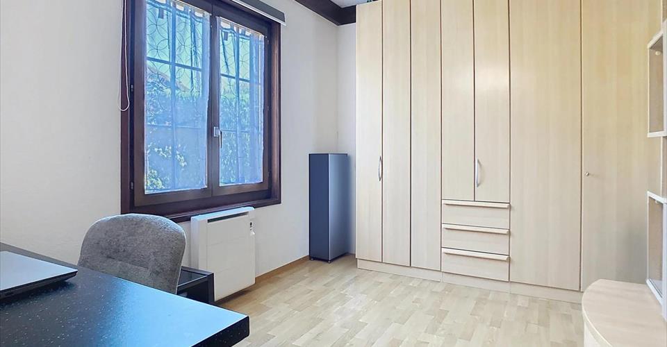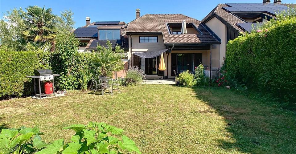 Située dans un quartier résidentiel à quelques minutes à pied de l’école internationale de la Châtaigneraie, cette maison mitoyenne est entièrement meublée et équipée. Elle profite d’un joli jardin arborisé. REZ-DE-CHAUSSÉE : – Entrée avec WC visiteurs – Pièce aménagée en bureau – Cuisine équipée ouverte – Pièce de vie avec cheminée et accès à la terrasse couverte et au joli jardin ÉTAGE : – 2 chambres, dont une très grande, avec accès à une terrasse plein Sud – Salle de bains SOUS-SOL : – Pièce aménagée en salle de jeux TV – Salle de douche – WC séparés – Buanderie équipée avec accès à une cave EXTÉRIEURES : – Terrasse couverte – Jardin privatif avec cabanon – 1 place de parc couverte – 1 place de parc extérieure Loyer mensuel CHF 4’500.- + charges individuelles (eau et électricité selon consommation) + entretien du jardin à charge du locataire DISPONIBLE : 1.8.2025