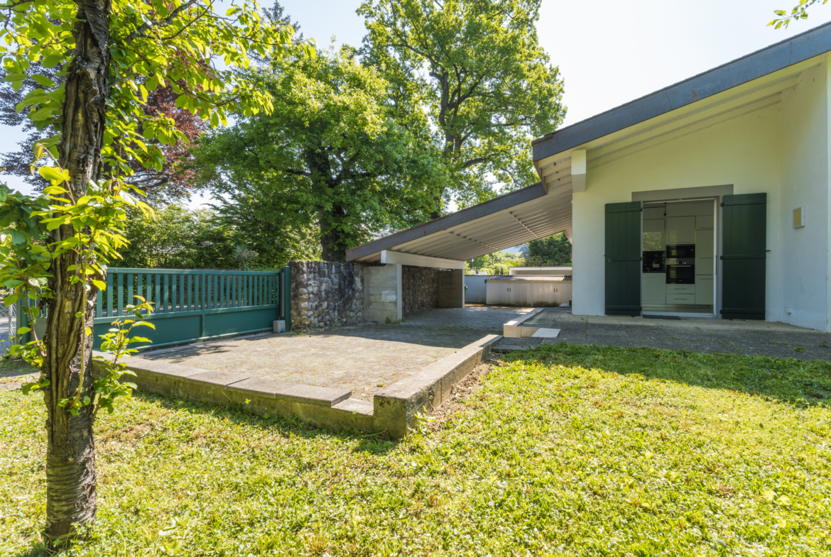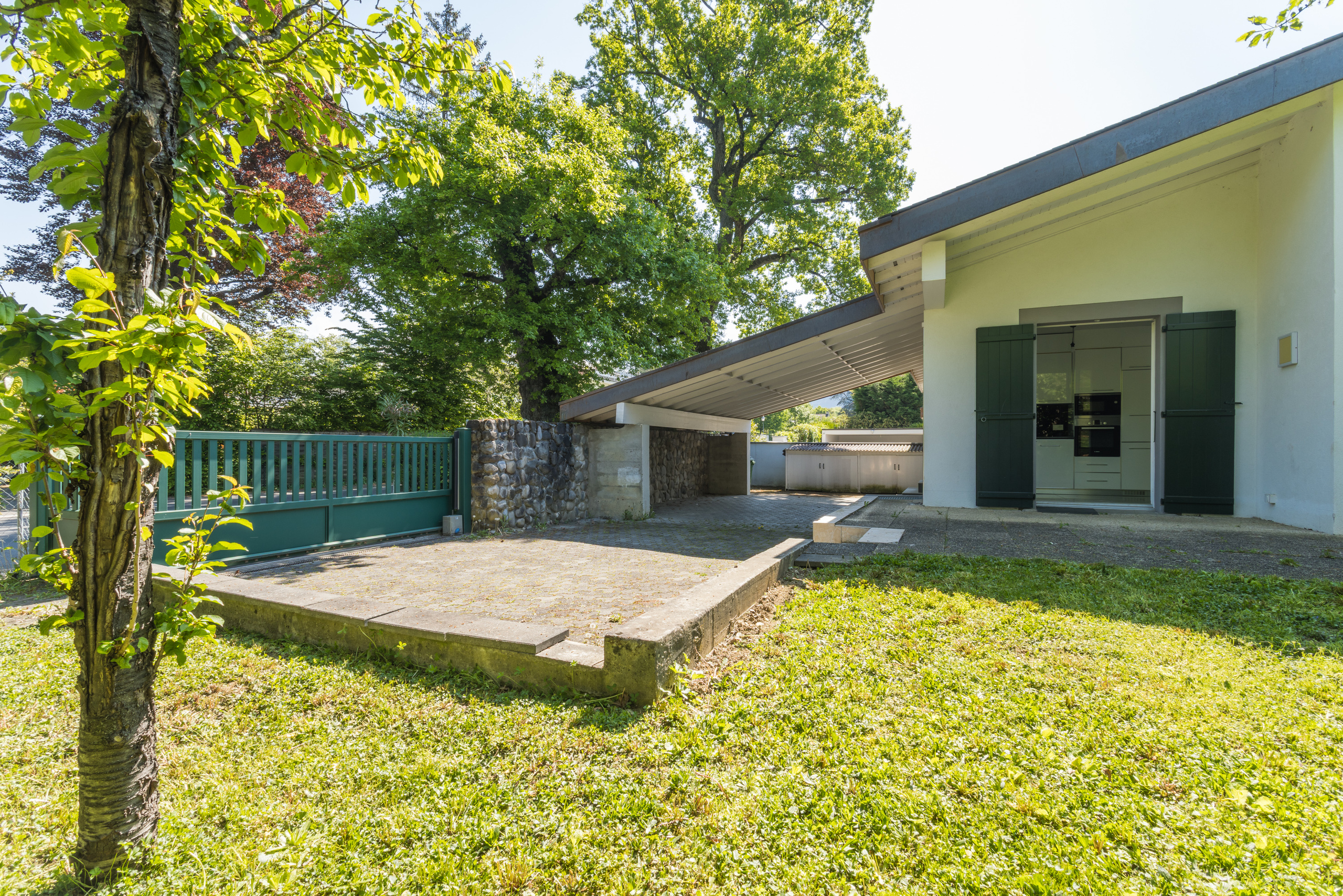 Un abri voiture intégré sous le prolongement de toiture propose plusieurs places de stationnement extérieures.