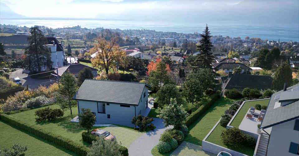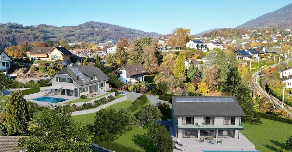 Cette villa de 5,5 pièces, située dans le quartier résidentiel d’Hauteville à Saint-Légier-La Chiésaz, offre un cadre de vie exceptionnel alliant vue, calme et verdure. D’une surface utile d’environ 302,75 m² (dont 189 m² habitables), elle est implantée sur une belle parcelle de 1’015 m² avec une magnifique piscine de 37 m². Son jardin de 616 m², agrémenté de belles terrasses, permettra de profiter pleinement des espaces extérieurs. Grâce à son emplacement privilégié, la propriété bénéficie d’un ensoleillement optimal tout au long de l’année, ainsi que d’une vue imprenable sur le lac Léman et les montagnes. Au rez-de-chaussée, un hall spacieux avec armoires encastrées mènera à une salle de bain et à un vaste espace de vie de 65 m², comprenant une cuisine ouverte et un séjour lumineux. De grandes baies vitrées donneront accès à la piscine et à la terrasse de 117 m². Un garage box intégré complètera cet étage. À l’étage, une suite parentale de 36 m² avec son dressing et sa salle de bain/WC, ainsi que deux chambres donnant sur la terrasse sud. Une quatrième chambre et une salle de douche/WC complètent ce niveau. Le sous-sol de 123 m² inclura un espace modulable, une cave, une buanderie et des locaux techniques. Depuis la villa, la vue panoramique embrassera la Riviera, le lac Léman et les Alpes. La villa dispose de plusieurs places de stationnement. Une visite sur place s’impose afin de découvrir les plans et d’apprécier tous les atouts de ce futur bien d’exception.