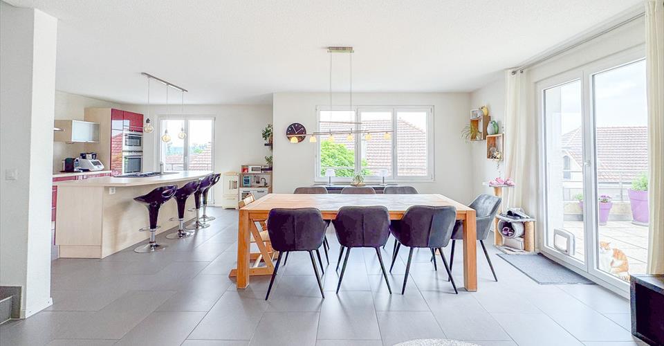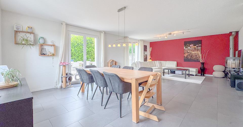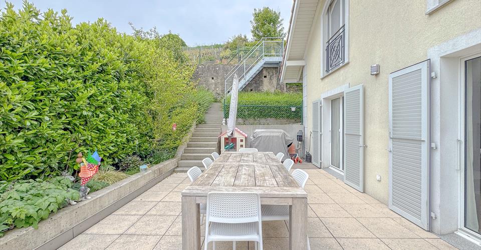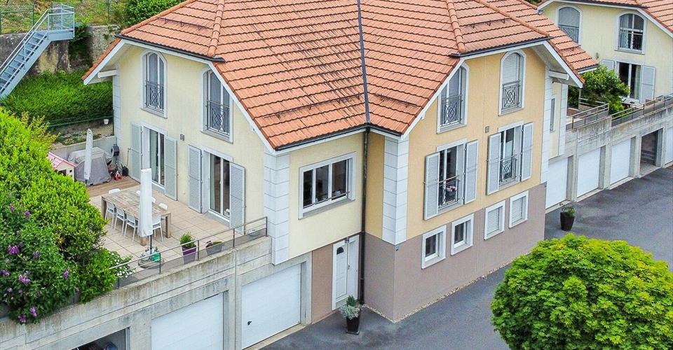 EXCLUSIVITE – PARFAIT ENTRETIEN – QUARTIER FAMILIAL Située au cœur d’un quartier résidentiel calme et recherché des Tuileries-de-Grandson, cette spacieuse maison mitoyenne avec garage séduit par son excellent état d’entretien et son cadre de vie idéal pour une famille. Bénéficiant d’une agréable orientation Sud-Ouest, elle offre une belle luminosité naturelle dans l’ensemble des pièces à vivre. Deux terrasses privatives viennent prolonger agréablement les espaces de vie, tandis qu’un petit coin de vignes confère à la propriété un charme singulier. Aucun travaux n’est à prévoir, la maison est parfaitement entretenue. Elle dispose d’un garage privatif ainsi que d’une place de parking à l’extérieur. Les commodités sont toutes accessibles à proximité immédiate : commerces, écoles, transports publics et différents services. La gare, située à seulement 800 mètres, permet de rejoindre Yverdon-les-Bains. Un arrêt de bus se trouve également à 400 mètres, facilitant les déplacements au quotidien. Elle se distribue de la manière suivante : Rez inférieur Garage avec porte électrique, accès direct à l’intérieur Bureau Hall d’entrée avec armoire-penderie Local technique Cave Rez supérieur Grande pièce à vivre lumineuse réunissant l’espace salle à manger et le salon (poêle à bois) Cuisine agencée ouverte avec ilot central Accès direct à la 1ère terrasse de 29 m2 WC visiteurs avec buanderie attenante A l’étage Couloir de distribution 3 chambres Salle d’eau composée d’une baignoire d’angle, d’un lavabo et d’un WC Salle d’eau composée d’une douche, d’un lavabo et d’un WC Combles Galetas A l’extérieur 1 place de parc Accès à la seconde terrasse en surplomb, offrant une vue dégagée sur le lac et sur le village Vignes privatives