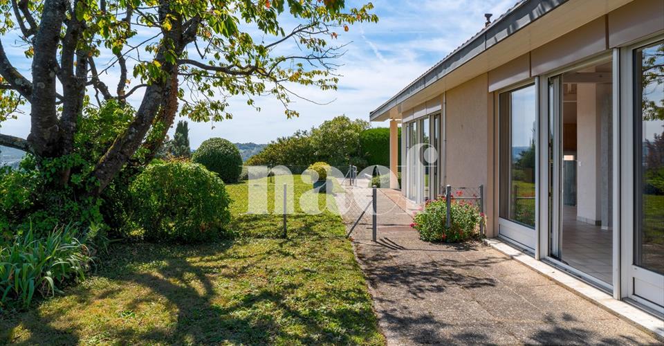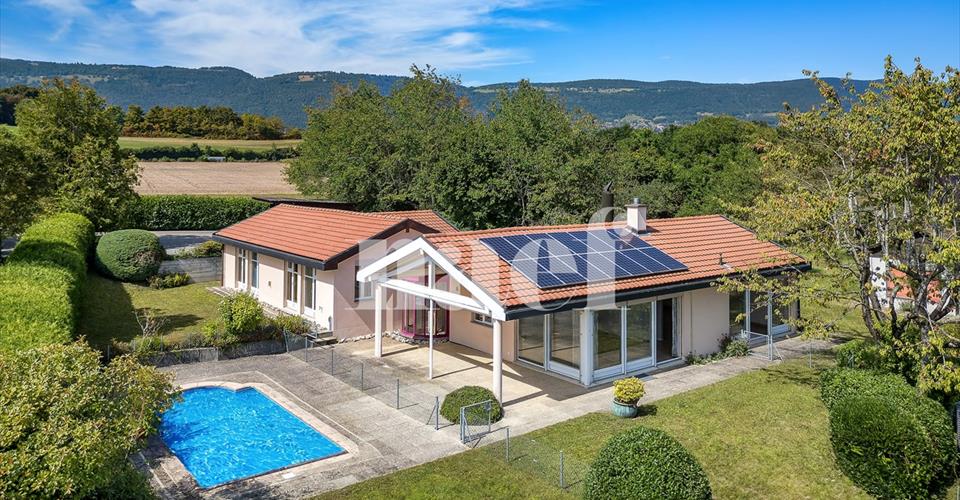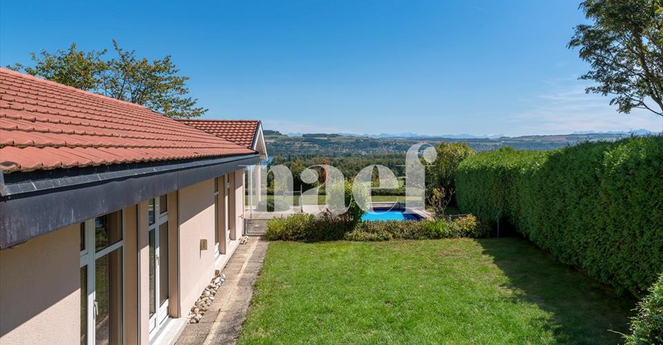 Située à Grandson, dans un cadre verdoyant et recherché, découvrez cette villa de 5.5 pièces offrant une surface habitable de 174 m² sur une belle parcelle de 1’301 m². Construite en 1991, elle séduit par son atmosphère chaleureuse, ses volumes généreux, ses espaces lumineux et son extérieur idyllique. Dès l’entrée, on ressent le confort et la générosité des espaces. Le séjour s’ouvre sur la terrasse et le jardin, créant une parfaite continuité entre intérieur et extérieur. Grâce à ses grandes baies vitrées, la villa bénéficie d’une abondante lumière naturelle. La cuisine, entièrement équipée et ouverte sur le séjour, complète cet espace convivial. La maison dispose de quatre chambres et de deux salles d’eau, offrant ainsi tout le confort nécessaire pour une famille. La terrasse couverte invite à partager des repas en toute saison, tandis que le jardin soigneusement arboré et fleuri garantit calme et intimité. Un panneau photovoltaïque, installé pour améliorer l’efficacité énergétique, constitue un atout supplémentaire et assure une consommation plus respectueuse de l’environnement. La piscine, parfaitement intégrée dans le jardin, transforme cette villa en un véritable lieu de vacances.