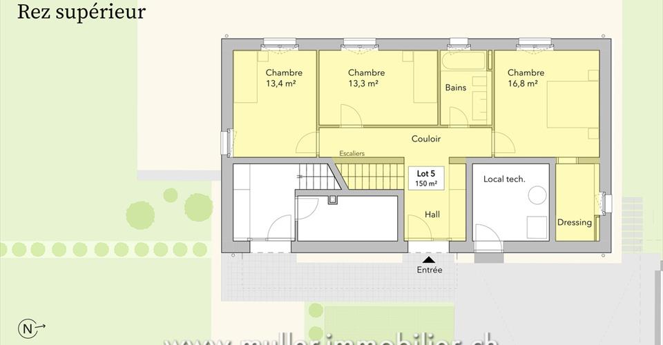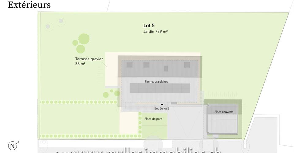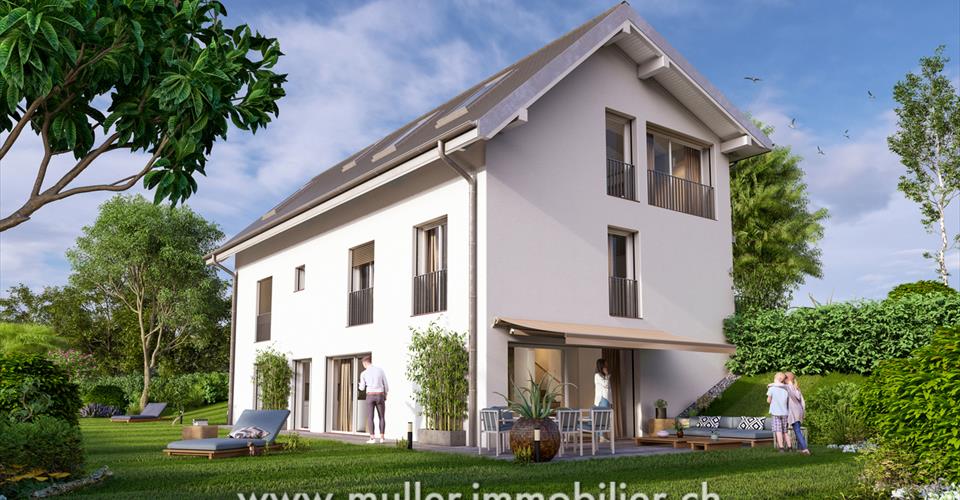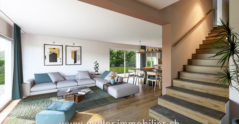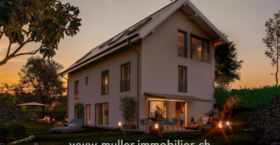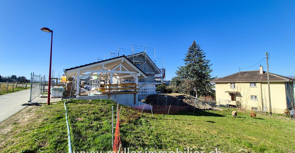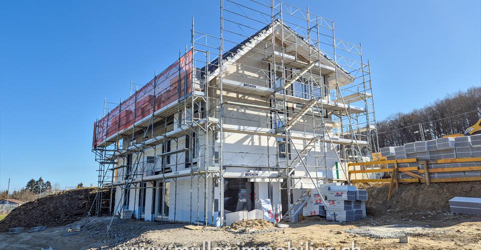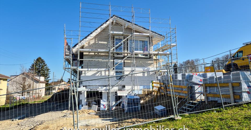 CONSTRUCTION HAS STARTED! On the border of an agricultural zone with a large garden of 739 m2, a terrace, 150 m2 of living space and 5 rooms. Independent semi-detached villa, perfect for a family! Duplex, south/west exposure. 5 minutes from the motorway and a short bus ride away. You can visit the house under construction on Saturday and Sunday! Give me a call. COMFORT Close-to-nature surroundings Attractive 55 m2 terrace A large garden of 739 m2 (including the terrace) Spacious and bright Large picture windows A storeroom A master suite with private shower room A second large bedroom with dressing room Two additional bedrooms Living space: 150 m2 Useful floor area: 158 m Land: 824 m2 Rooms : 5,5 Bathrooms : 3 Heat pump – underfloor heating The bathrooms, kitchen and floors are finished to the buyer’s preference. One outdoor parking space at CHF 20,000 is allocated to the lot. One covered parking space at an additional cost of CHF 40,000 is allocated to the lot. Availability: to be agreed. ACCESS 5 minutes from the motorway 12 minutes from Lausanne city centre 20 minutes from the lakeside (Vidy) Publics transport A few steps from the bus 20 minutes by bus to the city centre GROUND FLOOR A hallway at the bottom of the stairs opens onto a large 41 m2 living room with lounge, dining room, open-plan kitchen and access to the terrace. There is also a storeroom, a guest WC and a master suite with private shower room. FLOOR A large entrance hall, a bathroom and 3 bedrooms, including a large bedroom with dressing room. OUTDOORS A 55 m2 terrace in a large 739 m2 garden. Two parking places, one under cover. SITUATION Close to major roads in a residential area, on the edge of fields and close to the forest. On the side of a private dead-end road. NOTICE For English-speaker, please call Arlette on FACILITIES Environment Neighbourhood of villas Close-to-nature Bus stop Primary school Secondary school Riding school Close to a golf course Tennis centre Outdoors Terrace(s) Garden Silent/quiet Green surroundings Car park Covered car park Inside Open-plan kitchen Guest WC Dressing room Cellar Small room Triple glazing Bright Floor To be choosen Orientation South West Sun Optimal All day long View Wide opened
