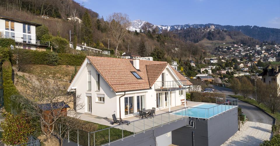 Cette belle propriété familiale est érigée sur les hauteurs de Montreux, à seulement 7 minutes de voiture du centre-ville et des nombreux commerces. Elle est située dans un quartier résidentiel du charmant village de Chernex. Sa situation, entre lac et vignes, confère à cette villa un cadre de vie recherché et lui permet de profiter d’une magnifique vue panoramique. – Distribuée sur 2 niveaux + sous-sol – Construction datant de 2005 – Espaces de vie spacieux et lumineux – Jardin, terrasse, piscine et étang – Garage double et 2 places de parc extérieures