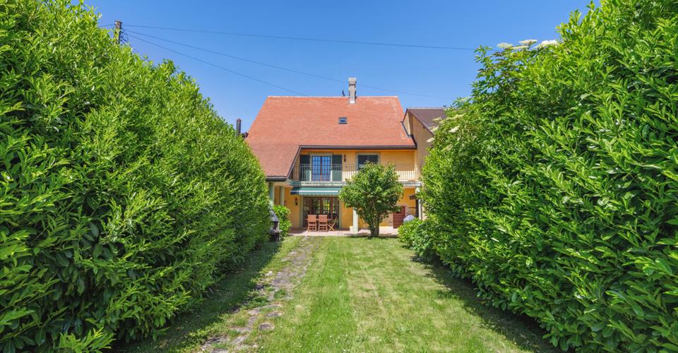 Située au cœur de la charmante commune d’Onnens, cette propriété de caractère, construite en 1850 et entièrement rénovée entre 1997 et 2006, offre environ 298 m² habitables répartis sur trois niveaux, dans un style raffiné mêlant influences méditerranéennes et finitions soignées. Avec 5,5 pièces, dont deux chambres, des combles aménagées à fort potentiel (cabinet professionnel, atelier ou bureau indépendant), une cuisine semi-ouverte jouxtée d’une dépendance discrète, ainsi qu’un bureau modulable au rez-de-chaussée, elle allie élégance, fonctionnalité et flexibilité d’usage. Le vaste jardin privatif, agrémenté de haies et d’un éclairage, crée un cadre intime et paisible. Il est prolongé par une belle terrasse attenante au rez-de-chaussée, tandis qu’une seconde terrasse, située à l’étage, permet de profiter de vues dégagées dans une atmosphère plus élevée et préservée. L’accès se fait soit depuis le centre du village, soit par une allée privée à l’arrière. Un sous-sol avec cave à vin, un premier étage doté de deux chambres avec salles de bains attenantes, un salon supplémentaire et un balcon, ainsi que de beaux volumes sous les toits, complètent ce bien rare. Onnens séduit par son calme, son environnement verdoyant, la présence du Centre Les Explorateurs — une école Montessori reconnue — ainsi qu’un très bel hôtel-restaurant dans le village, idéal pour accueillir famille et invités. La région offre également de nombreuses possibilités d’activités en plein air, entre lacs et sentiers, tout en restant proche des commodités et axes de communication majeurs. Enfin, le taux d’imposition communal attractif de 63,5 %, inférieur à la moyenne cantonale, renforce l’intérêt de cette demeure d’exception, disponible à convenir. Pour toute demande d’information supplémentaire ou pour organiser une visite, veuillez contacter Léon Tharin au +41 (0)78 264 09 19.