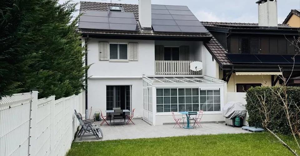 Magnifique Villa Contiguë Entièrement Rénovée à Vendre à Vessy Cette splendide villa contiguë, orientée plein sud, est mise en vente au prix de 2’250’000 CHF. Construite en 1984, elle offre une surface habitable de 140 m² sur un terrain de 273 m². Composée de 5,5 pièces, elle comprend trois chambres à coucher, un balcon au premier étage et deux salles de douche, dont une avec WC. La cuisine moderne est entièrement équipée avec des plaques à induction, une hotte d’aspiration, un four, un four micro-ondes, un lave-vaisselle, un frigo-congélateur et des espaces de rangement. Ouverte sur le salon, la salle à manger et la véranda, elle inclut également un comptoir pratique. Un WC visiteurs se trouve au rez-de-chaussée. La villa est équipée de panneaux photovoltaïques et d’une pompe à chaleur récents, garantissant une performance énergétique optimale. Elle offre une vue imprenable sur le Salève, la verdure et le voisinage. Les charges mensuelles s’élèvent à environ 200 CHF. Côté stationnement, quatre places de parc extérieures, dont une sous couvert, sont à disposition. La distribution des espaces est parfaitement optimisée. Les combles se trouvent au deuxième étage. Le premier étage accueille trois chambres, dont une avec balcon, ainsi que deux salles de douche, l’une équipée d’un WC. Au rez-de-chaussée, vous trouverez un hall d’entrée, un WC visiteurs, une cuisine ouverte, un salon, une salle à manger et une véranda lumineuse. Le sous-sol comprend une chambre avec salle de bains et WC, un dressing, un abri atomique, une buanderie ainsi qu’un local technique avec chaufferie. Entièrement rénovée, cette villa bénéficie d’une excellente luminosité grâce à son exposition plein sud. Située dans un quartier paisible et entourée de nature, elle constitue une opportunité rare à saisir. Contactez-nous dès aujourd’hui pour organiser une visite et découvrir ce bien d’exception.