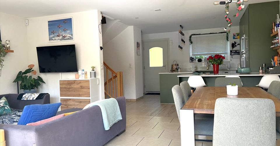 Située dans un quartier résidentiel, cette charmante maison mitoyenne offre un cadre de vie agréable et lumineux. Elle est répartie sur plusieurs niveaux, comprenant un bel espace de vie, une cuisine moderne entièrement équipée, plusieurs chambres lumineuses. À l’extérieur, vous profitez d’un jardin privatif soigneusement entretenu. Un bien idéal pour une famille à la recherche de confort et de qualité de vie, à proximité des commodités, écoles et transports. Distribution : Rez-de-chaussée : Hall d’entrée avec armoires WC visiteurs Cuisine ouverte entièrement équipée Vaste séjour et salle à manger avec poêle à bois, avec accès à la terrasse-jardin 1er étage : Trois chambres à coucher, dont une avec balcon Salle de bains / WC 2ème étage: Chambre parentale climatisée, avec dressing Salle de douche-bains/WC Espace de stockage/dressing Sous-sol : Local technique avec buanderie (non-équipée) Deux caves Garage pour deux véhicules Chauffage au gaz et poêle à bois En sus : Charges individuelles
