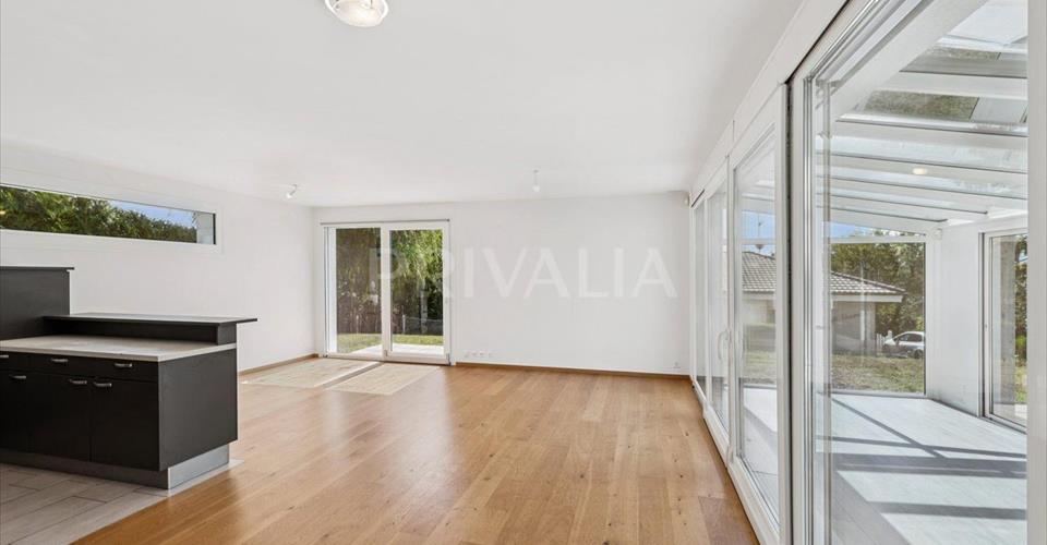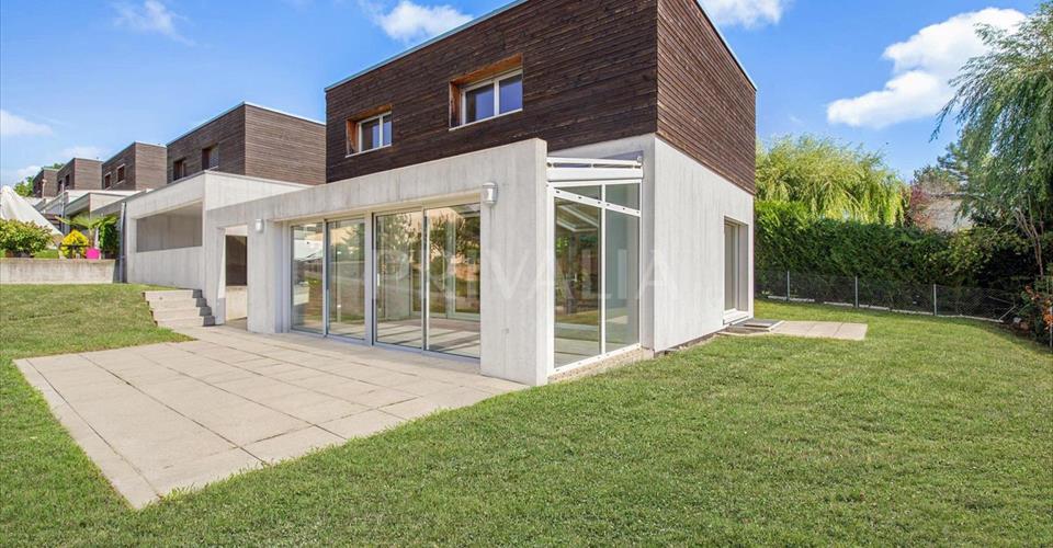 Située sur la commune de Bellevue, au sein d’un environnement résidentiel, cette belle villa contemporaine en pignon offre une surface habitable de 128 m2, une véranda de 19m2 et un sous-sol de 64m2, totalisant 211 m2 utiles, sur une jolie parcelle clôturée d’environ 540 m2. Bâtie en 2012 et disposant du label Minergie®, elle bénéficie de prestations de qualité telles que cuisine entièrement équipée, stores électriques, grandes baies vitrées, véranda, nombreux rangements, puit de lumière, système de chauffage et eau chaude à travers une pompe à chaleur avec sonde géothermique et panneau solaire en toiture entre autres. La villa se distribue comme suit : Rez-de-chaussée (83 m2) : – Hall d’entrée avec vestiaire – Séjour / salle à manger prolongé par une véranda de 19 m2 – Cuisine ouverte entièrement équipée de 16 m2 – WC visiteurs 1er étage (64 m2) : – Trois chambres à coucher – Salle de bains avec puit de lumière Sous-sol (64 m2) : – Grande pièce polyvalente – Cave – Salle de douche avec WC – Local technique (chauffage gaz) Édifiée sur une parcelle de 540 m2, la villa bénéficie également d’un jardin d’environ 270 m2 entièrement clôturé ainsi que d’une terrasse de 28 m2, idéale pour profiter des beaux jours. Un double parking privé sous couverts de 30 m2 complète ce bien. A proximité de toutes les commodités (transports publics, gare CFF, école primaire, etc.), à 5 minutes en voiture de l’aéroport et à 15 minutes en voiture du centre-ville de Genève.