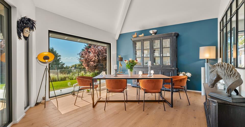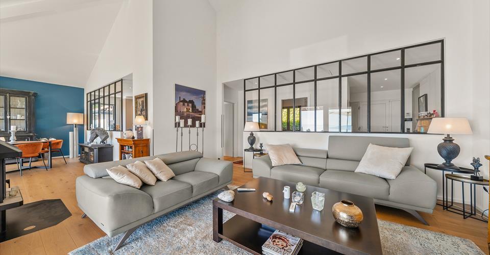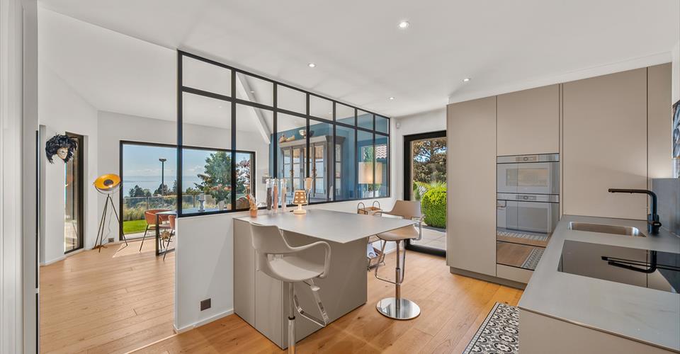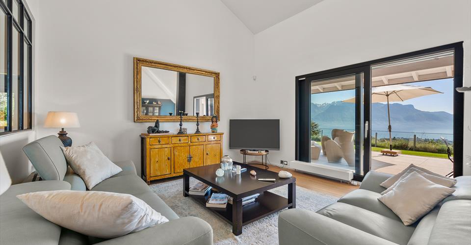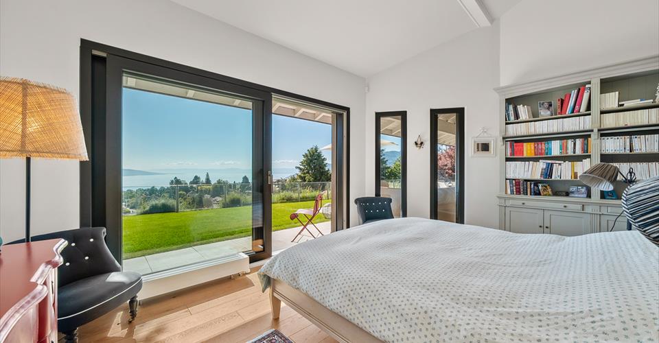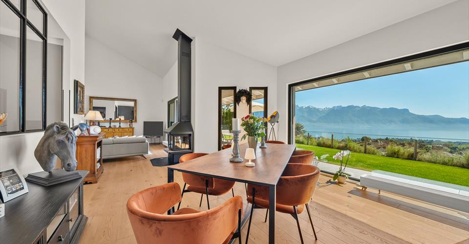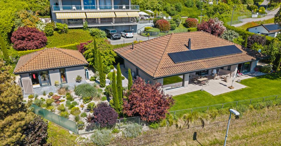 Villa de standing, vue lac et jardin méditerranéen à Blonay Nichée dans un quartier résidentiel prisé, à seulement quelques minutes du centre de Blonay, cette villa de plain-pied séduit par son emplacement privilégié, son vue spectaculaire sur le lac Léman et les Alpes, et son atmosphère intimiste. Entièrement rénovée avec soin en 2018 et 2022, la propriété allie matériaux de qualité, finitions haut de gamme et une esthétique raffinée, pensée pour offrir un cadre de vie élégant et confortable. Organisée sur un seul niveau, la maison offre de généreux volumes de réception, sublimés par de belles hauteurs sous plafond et une lumière naturelle abondante, grâce à son orientation plein sud. L’ambiance intérieure mêle modernité, chaleur et sobriété dans un esprit résolument cosy. Édifiée sur une parcelle de 1’526 m², la villa bénéficie d’un splendide jardin paysager aux accents méditerranéens, avec plusieurs terrasses aménagées pour profiter pleinement du calme et de la vue, en toute intimité. Une annexe indépendante, véritable espace bien-être, complète ce bien rare : elle comprend un sauna, une salle de douche et un espace de détente avec vue sur le lac et le jardin – un lieu parfait pour se ressourcer. L’emplacement est idéal : à proximité immédiate des écoles internationales, des commerces et des transports publics, tout en profitant du calme et de la discrétion d’un environnement résidentiel.