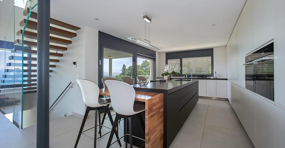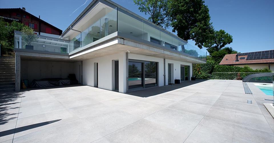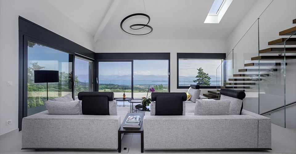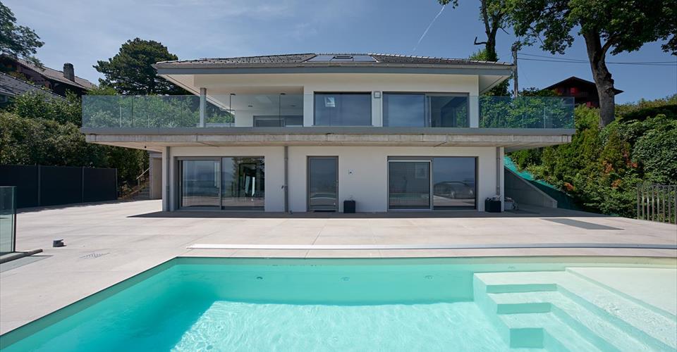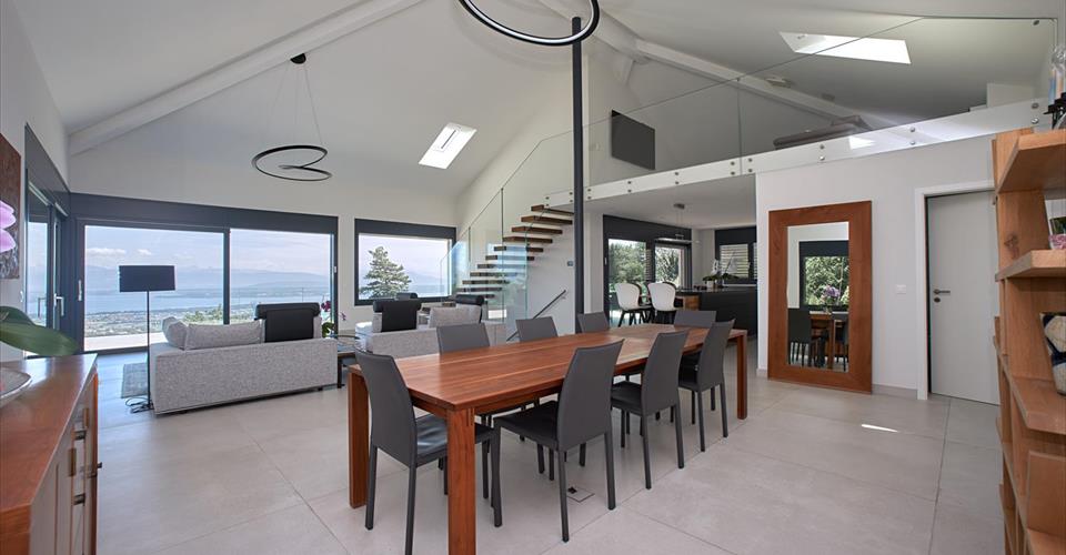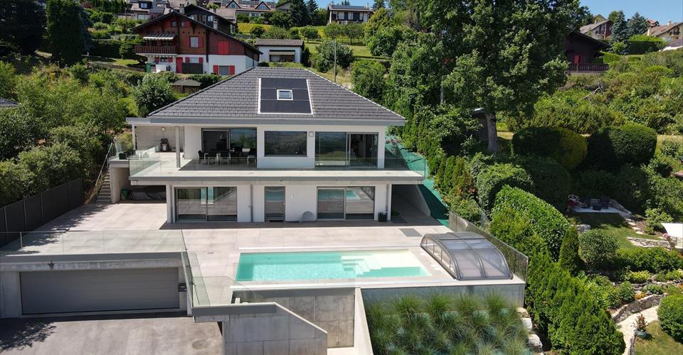 Située dans le quartier paisible et verdoyant d’Arzier, cette villa contemporaine offre plus de 450 m² d’espace utilisable sur quatre niveaux, avec des vues imprenables s’étendant du sud-est au sud-ouest. Avec une façade blanche épurée et un design architectural minimaliste, la propriété est conçue pour le confort, la fonctionnalité et la lumière. La pièce de vie principale d’environ 70 m² est dotée de hauts plafonds et de fenêtres du sol au plafond à triple vitrage, permettant à la lumière naturelle de circuler dans tout l’espace. Des carreaux de grand format (1,20 m x 1,20 m) dans des tons beige-gris s’étendent de l’intérieur aux terrasses extérieures, créant une forte continuité entre l’intérieur et l’extérieur. Les vastes terrasses, protégées par des garde-corps en verre, offrent des vues panoramiques à 180° et un accès direct à une piscine chauffée. La piscine est dotée de larges marches servant également d’espace de détente, idéal pour se relaxer et profiter du paysage environnant. La maison comprend quatre chambres, dont une suite parentale de 40 m² avec salle de bain privée et dressing. Il est possible d’étendre cet espace avec un espace bien-être. L’escalier flottant, en bois de couleur chêne et entouré de verre double paroi, est un élément central de la maison. Cette teinte de chêne se retrouve dans le bar de la cuisine et plusieurs salles de bain, créant une cohérence visuelle et une chaleur. Les caractéristiques supplémentaires comprennent : – Une salle de sport – Une cave à vin fonctionnelle – Une pièce polyvalente de 56 m² dans le sous-sol entièrement isolé et chauffé – Un accès interne direct à un garage pour trois voitures, avec bornes de recharge électrique et espace de rangement pour vélos ou usage d’atelier – Une grande pompe à chaleur assurant des températures intérieures constantes toute l’année – Sans jardin à entretenir et avec un accent sur une vie pratique et moderne, cette propriété offre un style de vie nécessitant peu d’entretien dans un cadre calme et verdoyant avec des vues étendues. Niché sur les pentes surplombant la région du lac Léman, Arzier-Le Muids offre un cadre résidentiel paisible entouré de nature, avec des vues imprenables sur le lac et les Alpes. Le village allie tranquillité et proximité des destinations clés, ce qui le rend idéal pour les familles et les professionnels. L’aéroport international de Genève se trouve à environ 35 minutes en voiture. Nyon et le bord du lac sont accessibles en 12 minutes, offrant un accès à l’autoroute (A1) et aux grands centres commerciaux comme le Signy Centre. Une école primaire est située directement à Arzier, tandis que des écoles secondaires sont disponibles à Nyon. Le village est desservi par le train NStCM, le reliant efficacement à la gare de Nyon et au réseau ferroviaire suisse plus large. Les amateurs de plein air apprécieront l’accès facile aux forêts du Jura, aux sentiers de randonnée et aux domaines skiables à proximité. Arzier-Le Muids est connu pour sa tranquillité, son air pur et sa qualité de vie, tout en restant bien connecté à Genève, Lausanne et aux écoles internationales de la région. Vidéo promotionnelle crée par https://www.tulipfilms.ch/