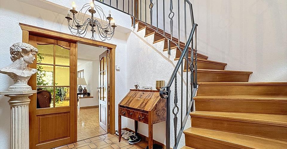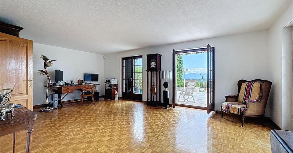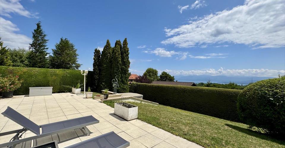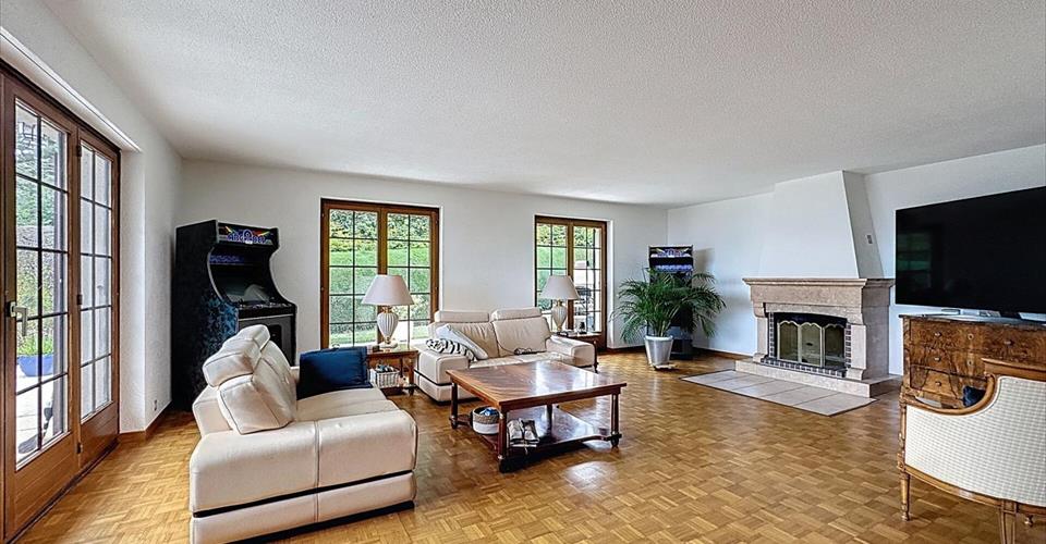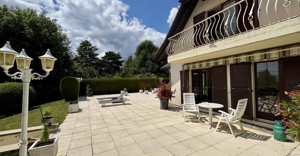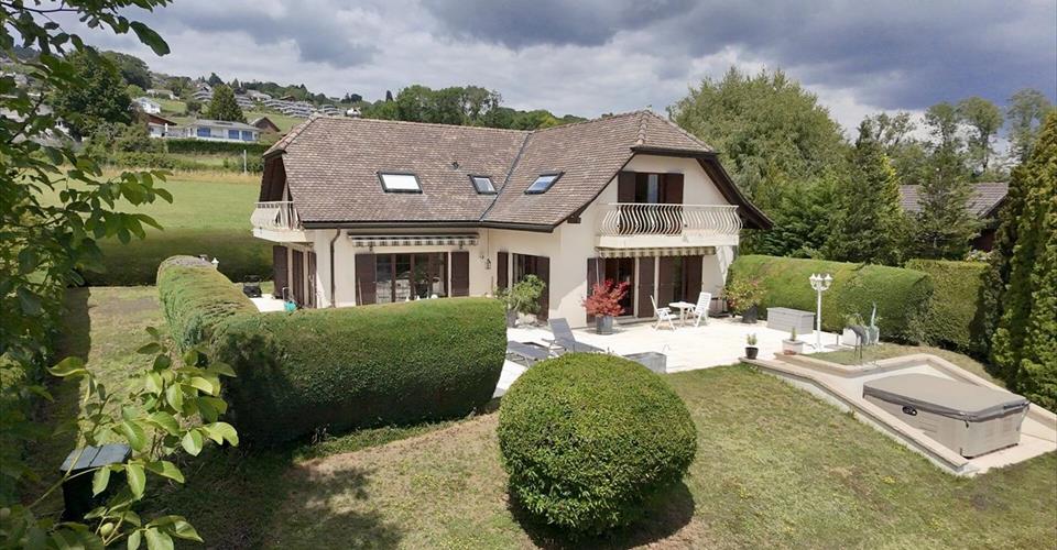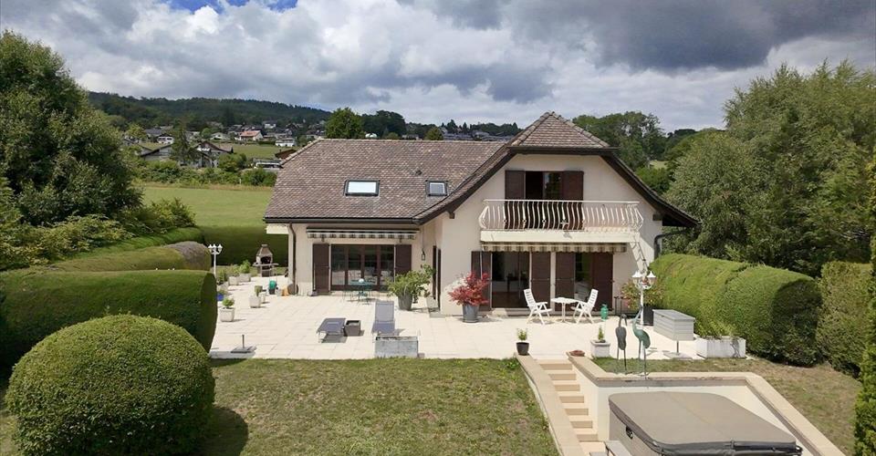Alliant espace et potentiel, propriété individuelle avec vue lac Idéalement située dans un cadre privilégié, cette propriété familiale développe plus de 400 m² utiles et séduit par ses volumes généreux ainsi que son panorama exceptionnel sur le lac et la chaîne des Alpes. Elle présente en outre un atout rare : la possibilité de créer un studio indépendant, idéal pour accueillir des proches, offrir un espace autonome à un adolescent ou générer un revenu locatif. Distribution Sous-sol Garage double avec accès direct à la maison Local technique fonctionnel Grand disponible offrant de multiples possibilités de rangement Cave Deuxième disponible aménageable, offrant la possibilité de créer un studio indépendant Rez-de-chaussée Hall d’entrée accueillant avec escalier desservant l’ étage WC visiteurs Cuisine spacieuse et fermée, équipée d’un garde-manger, avec accès direct à la salle à manger et à la terrasse Séjour lumineux avec cheminée, prolongé par une terrasse offrant un bel espace extérieur convivial Étage Suite parentale avec armoires encastrées et balcon jouissant d’une magnifique vue sur le lac Chambre avec armoires encastrées, salle de douche attenante (WC et lavabo) et balcon privatif Troisième chambre également équipée d’armoires encastrées Salle de douche supplémentaire avec WC et lavabo Travaux réalisés Remplacement du chauffage par une pompe à chaleur (septembre 2023) Isolation Peintures Aménagements extérieurs La parcelle est entièrement clôturée Accès avec porte automatique Parking Terrasse Jardin Jacuzzi